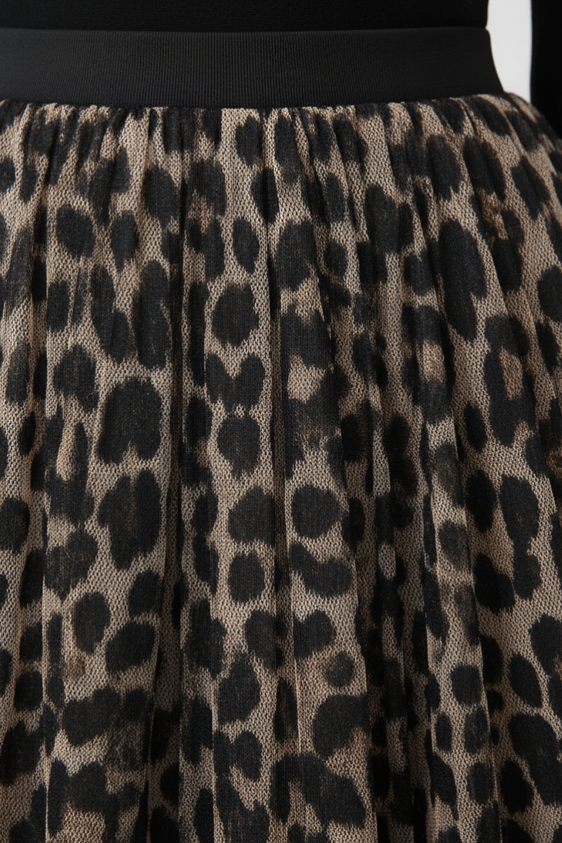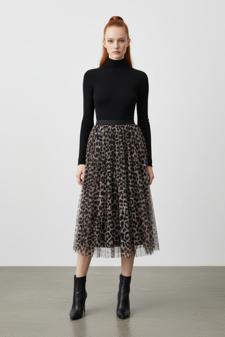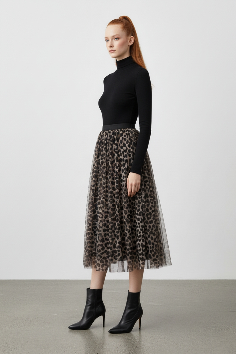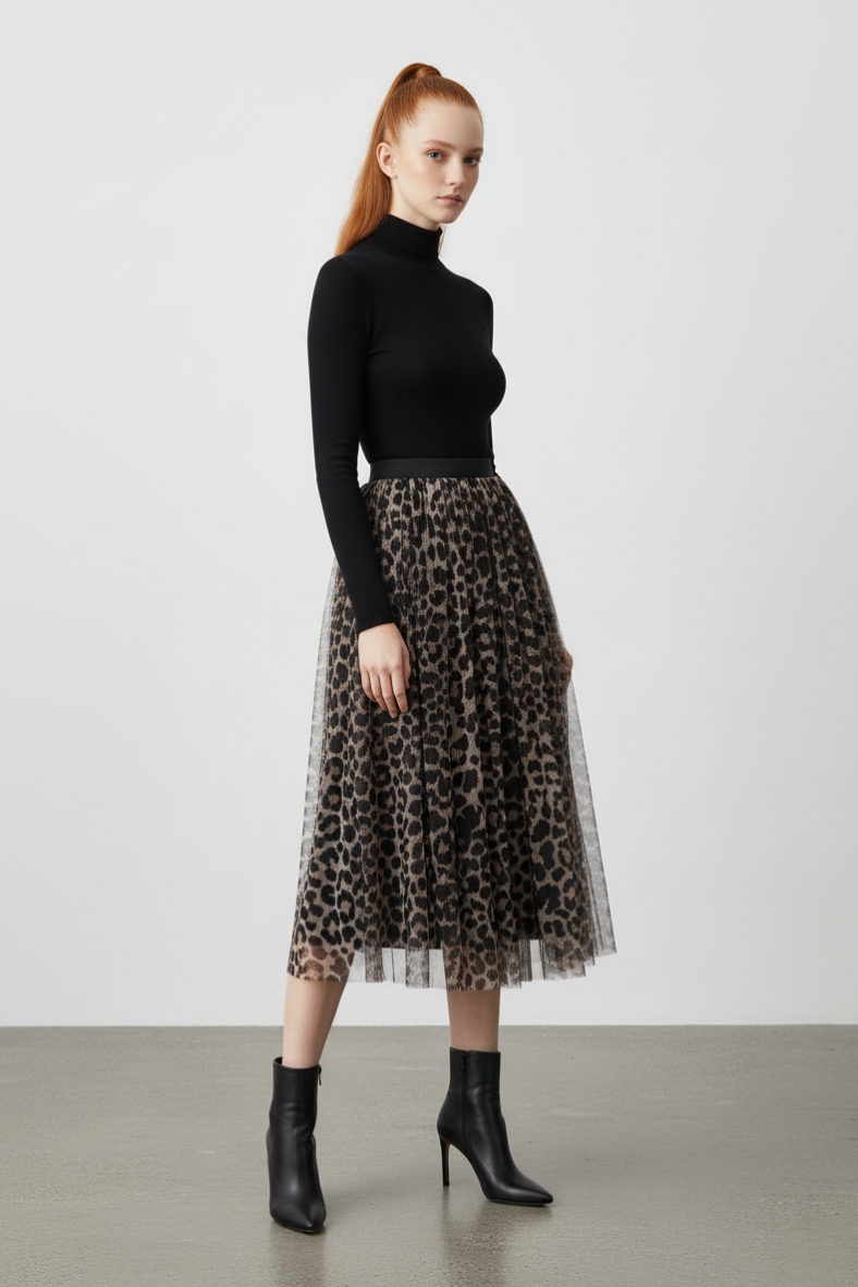 Questa gonna è ideale anche per il giorno: indossala con una camicia bianca e sneakers per un’interpretazione casual ma chic. La versatilità di questo capo ti permetterà di passare facilmente da un look da ufficio a uno da sera, semplicemente cambiando le scarpe e gli accessori. Con la gonna midi in tulle leopardato, ogni outfit diventa un’affermazione di stile.