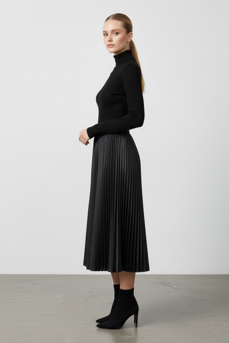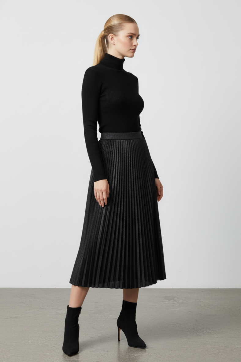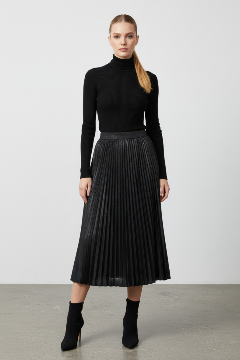 La gonna plissettata elegante è il capo ideale per chi desidera unire comfort e stile. Realizzata con un tessuto di alta qualità, questa gonna offre una vestibilità regolare che si adatta perfettamente alla silhouette femminile. Il suo design plissettato non solo aggiunge movimento, ma crea anche un effetto visivo affascinante, perfetto per ogni occasione. Puoi abbinarla facilmente a un maglione aderente per un look casual-chic, oppure optare per una camicia elegante per un outfit da ufficio impeccabile. Gli stivali alti completano perfettamente il look, donando un tocco di sofisticatezza. Non dimenticare di accessorizarla con una cintura in vita per esaltare ulteriormente la tua figura. La gonna è versatile e può essere indossata sia di giorno che di sera, rendendola un pezzo chiave del tuo guardaroba autunnale. Scegli di indossarla con un blazer per un look professionale o con una giacca di pelle per un tocco rock. Non lasciarti sfuggire l’opportunità di aggiungere questa gonna plissettata elegante al tuo armadio: è il perfetto equilibrio tra moda e funzionalità.