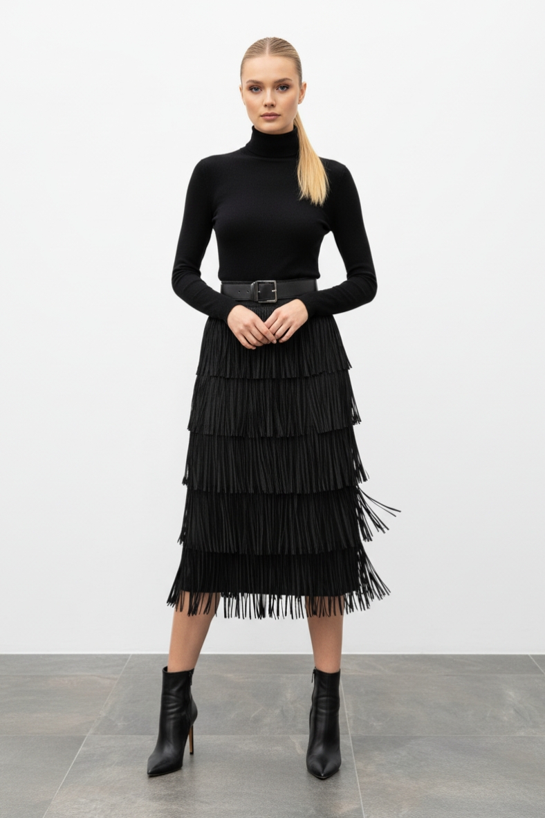 La gonna nera con frange è il pezzo chiave per un guardaroba autunnale e invernale che non passa inosservato. Caratterizzata da un design elegante e moderno, questa gonna midi presenta frange che danzano ad ogni passo, conferendo movimento e vitalità al tuo outfit. Realizzata con materiali di alta qualità, offre una sensazione di morbidezza al tatto, perfetta per avvolgerti in un abbraccio caldo durante le giornate più fresche.