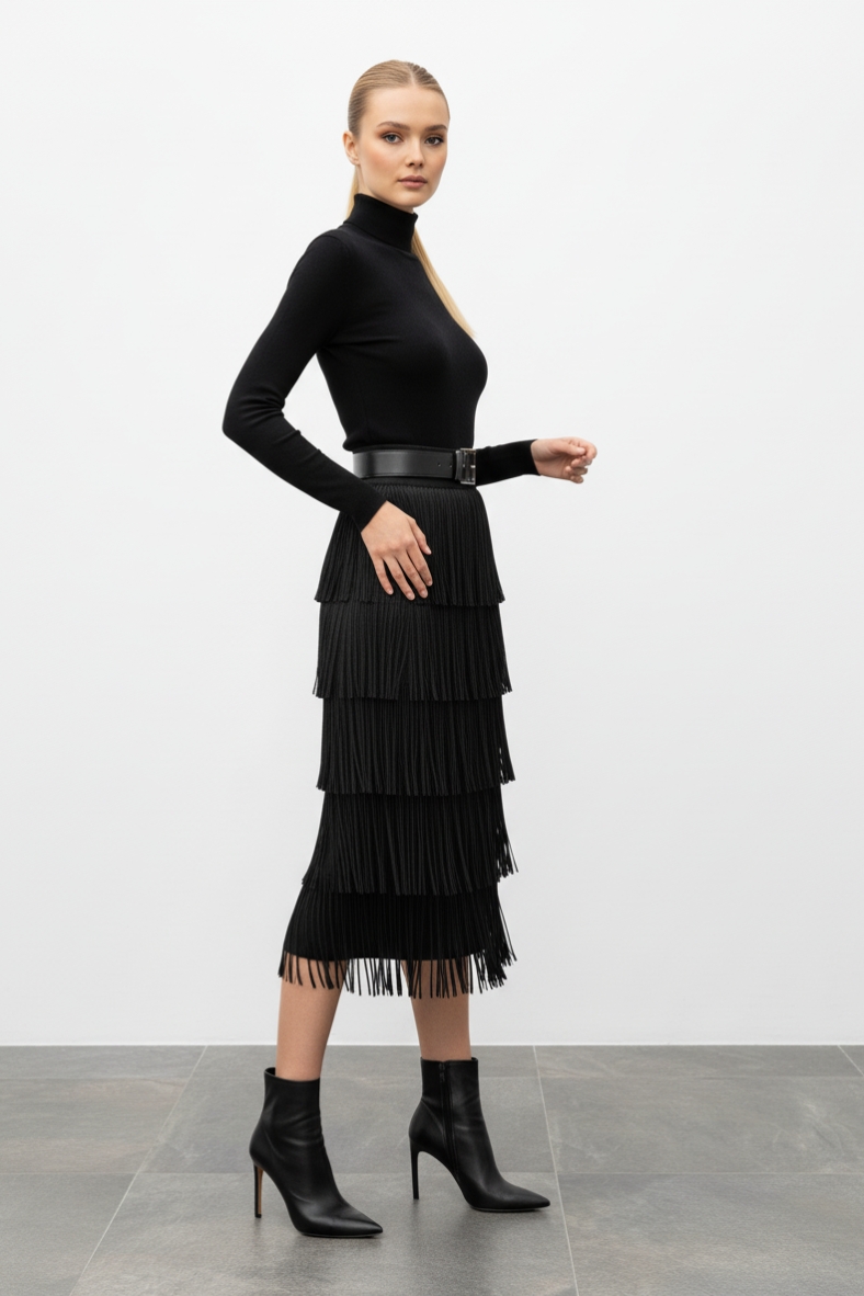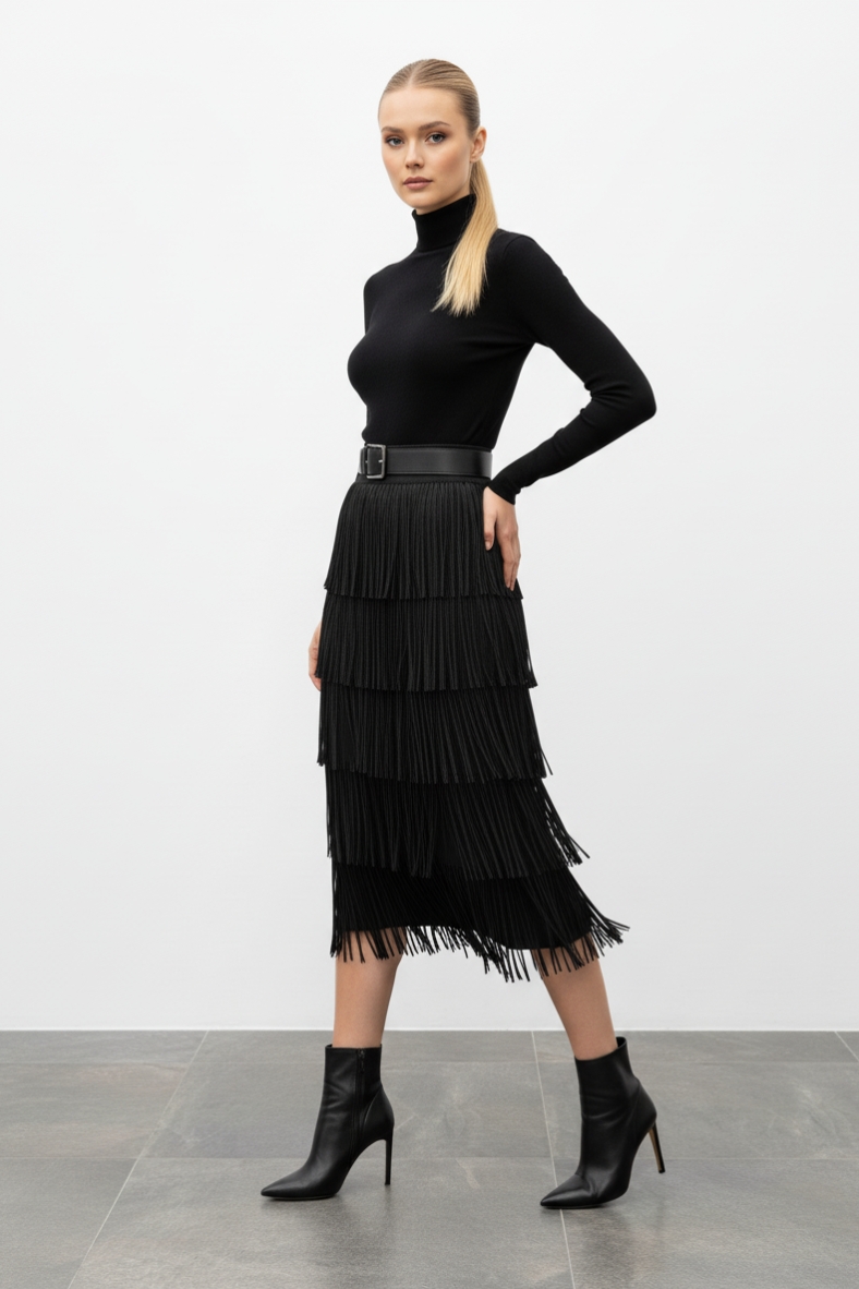 Non dimenticare di accessorize: una cintura in vita può enfatizzare la silhouette e aggiungere un tocco di eleganza. Gli orecchini pendenti e una borsa a tracolla completano il look, rendendolo perfetto per qualsiasi occasione. Con la gonna nera con frange, ogni outfit diventa un’affermazione di stile e personalità, rendendola un must-have per la stagione.