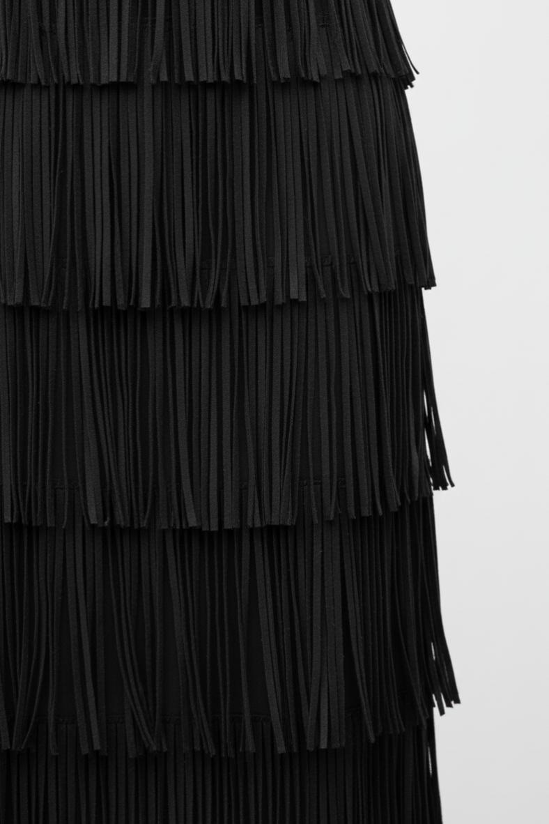 La gonna nera con frange è un capo versatile e di tendenza, ideale per creare look audaci e sofisticati. Realizzata con materiali di alta qualità, offre comfort e stile in ogni occasione.