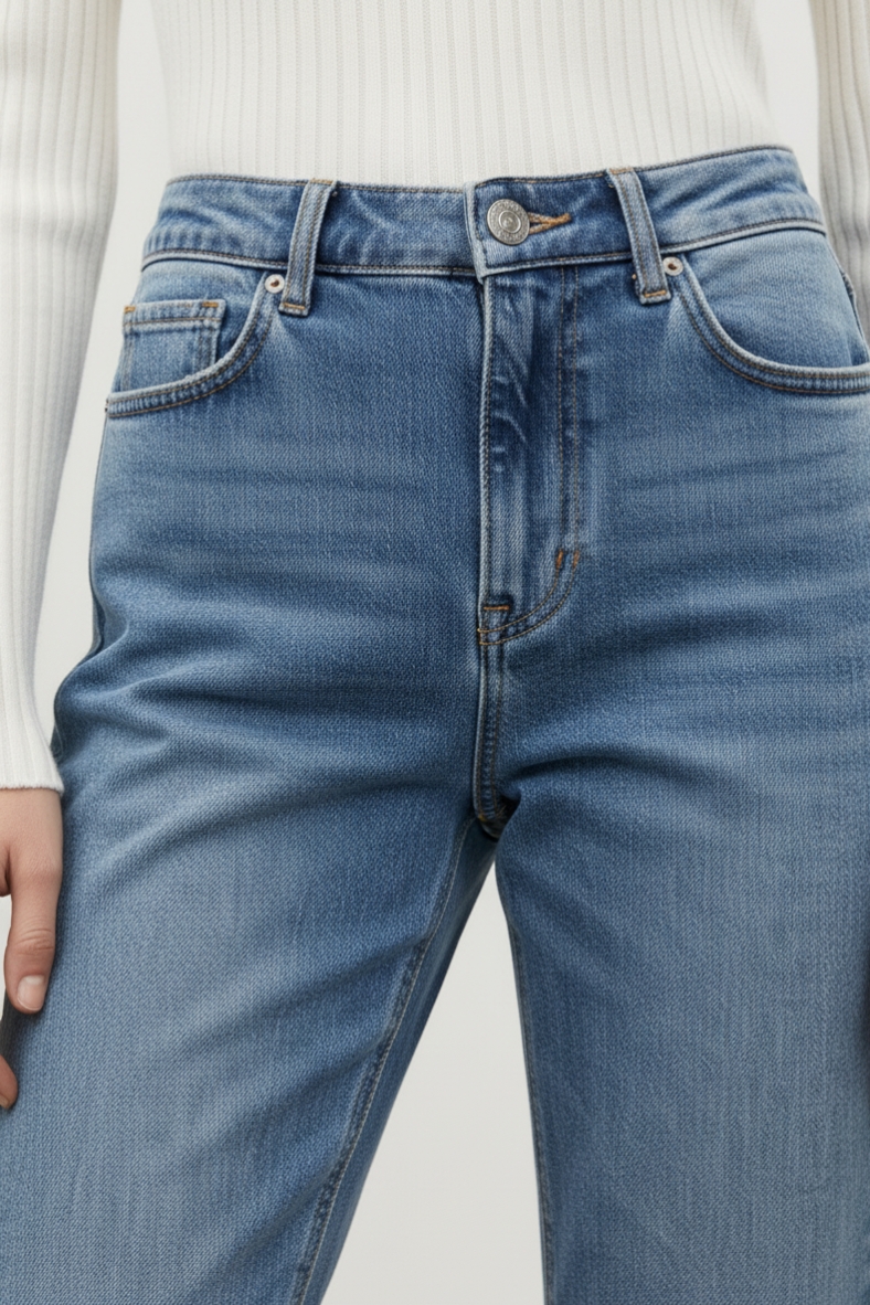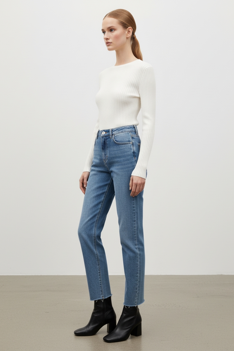 La lunghezza dei jeans, che termina appena sopra la caviglia, è perfetta per mettere in mostra un paio di scarpe alla moda, che siano sneakers o décolleté. Non dimenticare di giocare con le proporzioni: un top più ampio può bilanciare la silhouette slim dei jeans, creando un look armonioso e trendy.