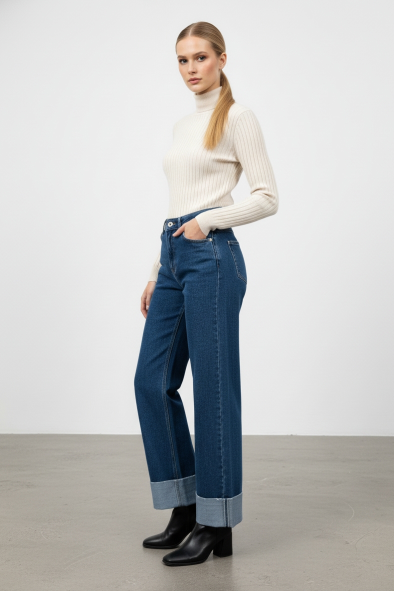 I jeans wide leg con risvolto sono un must-have per il tuo guardaroba. Realizzati in cotone, offrono una vestibilità comoda e alla moda, ideali per ogni occasione.
