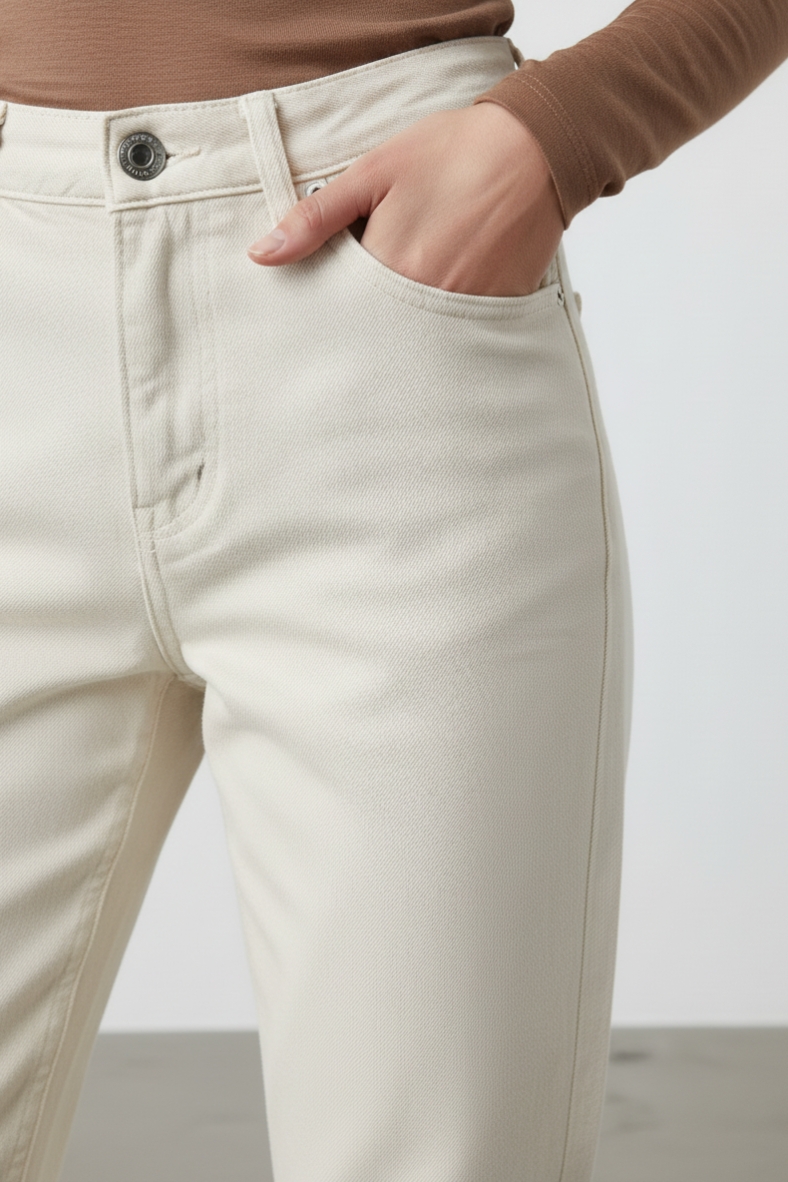 Caratterizzati da un design semplice ma elegante, questi jeans presentano una chiusura con bottone e zip, oltre a tasche frontali e posteriori che aggiungono un tocco pratico e funzionale. La tonalità chiara dei jeans li rende facilmente abbinabili, permettendo di creare look casual o più sofisticati a seconda delle occasioni.
