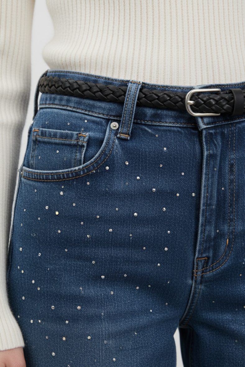 I jeans wide leg con strass sono il capo versatile che ogni donna dovrebbe avere nel proprio armadio. Realizzati con una miscela di cotone di alta qualità, questi jeans offrono una sensazione di morbidezza al tatto, garantendo comfort per tutto il giorno. La loro vestibilità regolare si adatta perfettamente a diverse silhouette, esaltando la figura senza costringere. La vita alta e le tasche posteriori ben posizionate aggiungono un tocco di stile, rendendoli ideali sia per un look casual che per un’uscita serale.