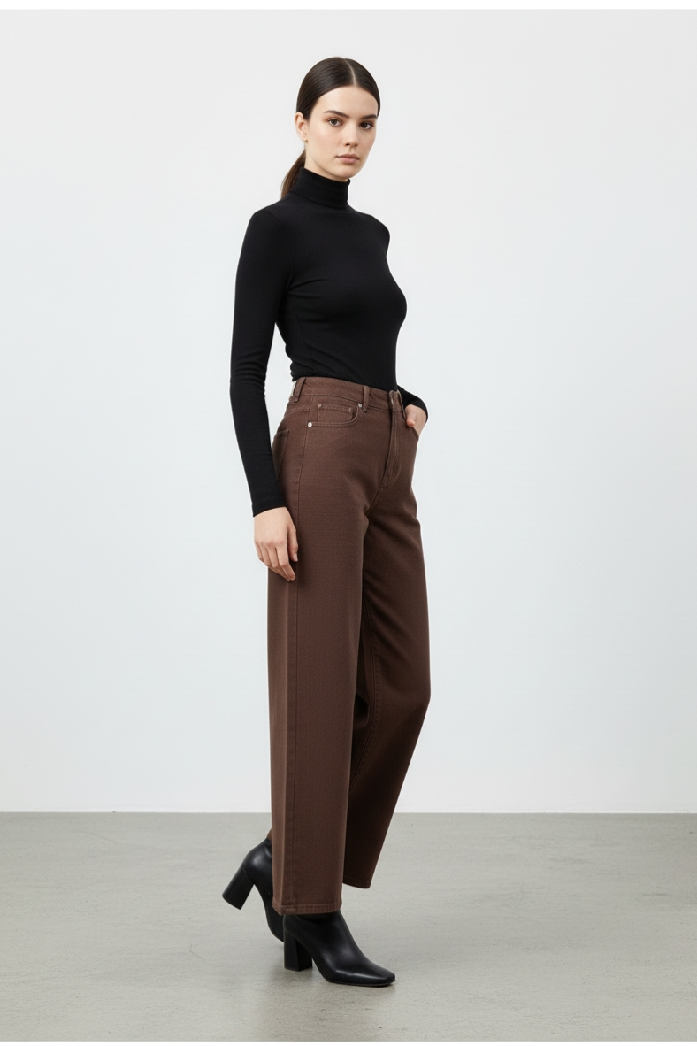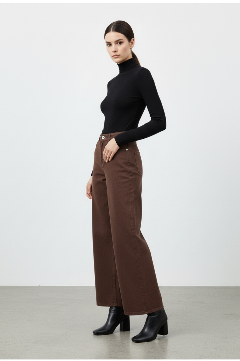 Per un look chic e sofisticato, prova ad abbinarli con un dolcevita in maglia, come quello che indossa la modella, e stivaletti con tacco. Questo contrasto tra la silhouette ampia dei jeans e la linea più aderente del dolcevita crea un equilibrio perfetto, esaltando la tua figura. Non dimenticare di completare il tuo outfit con una cintura in vita per definire ulteriormente la silhouette.