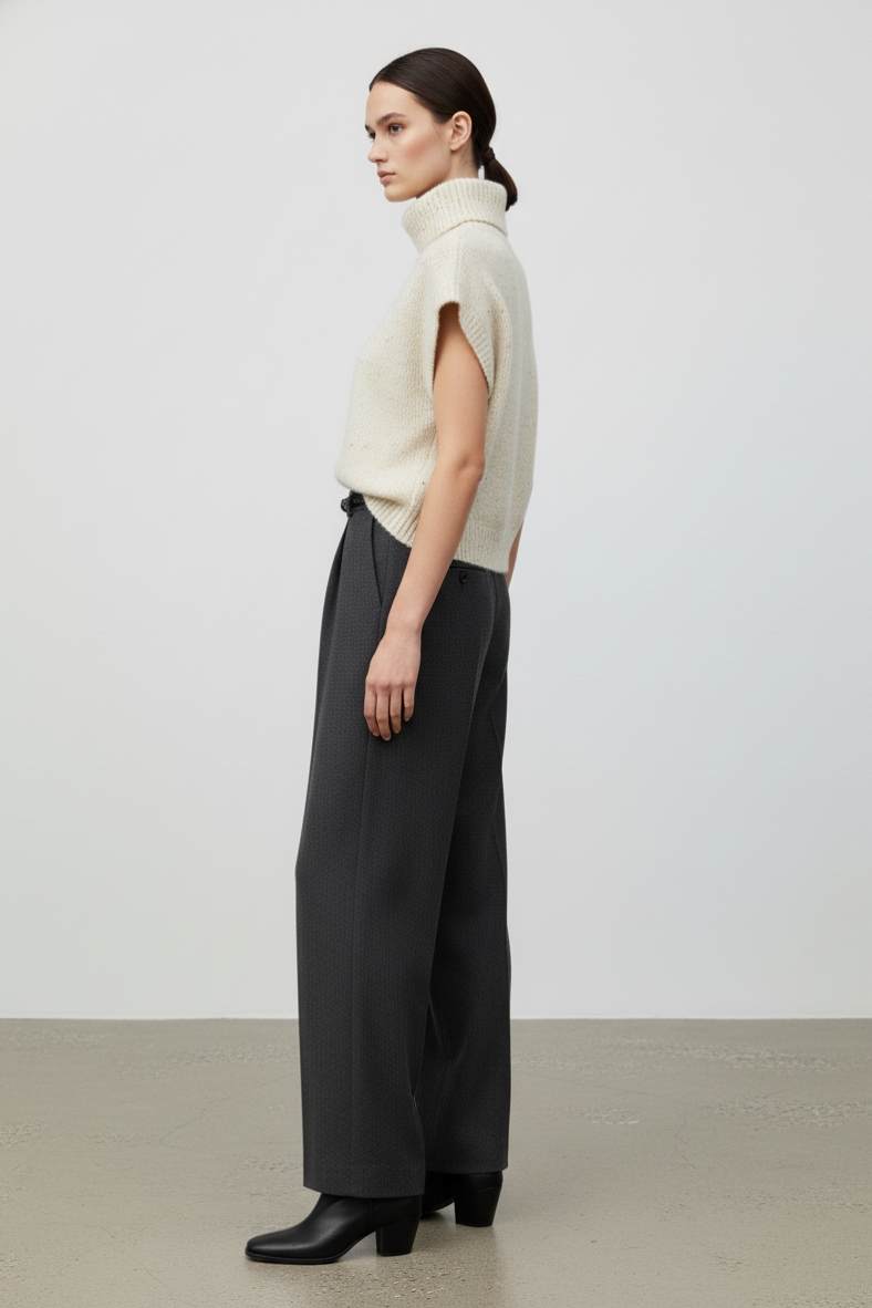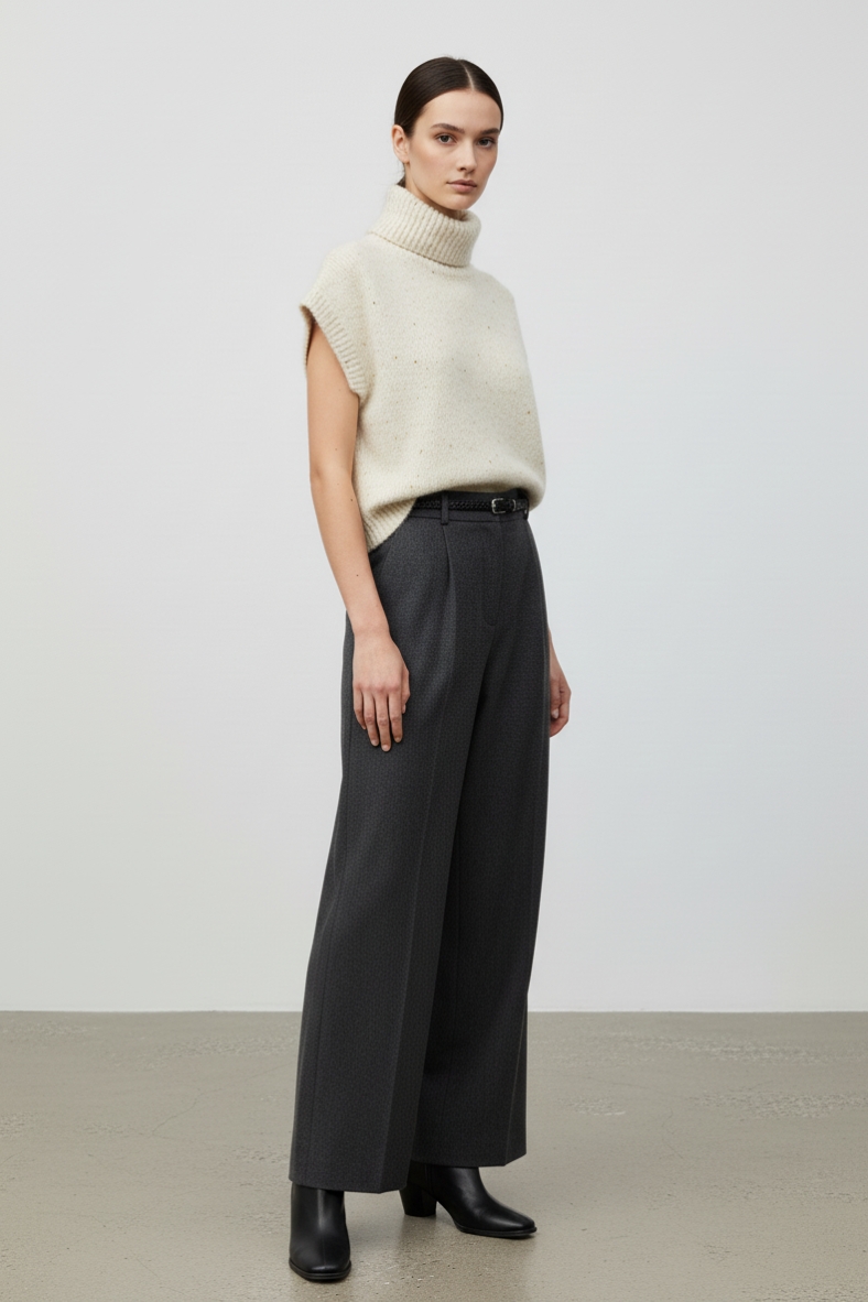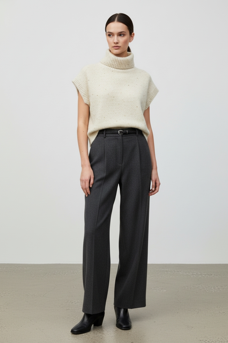 Per un look chic e moderno, abbinala a pantaloni a palazzo in tessuto leggero e stivaletti in pelle. Questo abbinamento non solo esalta la silhouette, ma crea anche un contrasto affascinante tra la morbidezza della maglia e la struttura dei pantaloni. Per completare il tuo outfit, puoi aggiungere una cintura in vita per definire la figura e dare un tocco di classe.