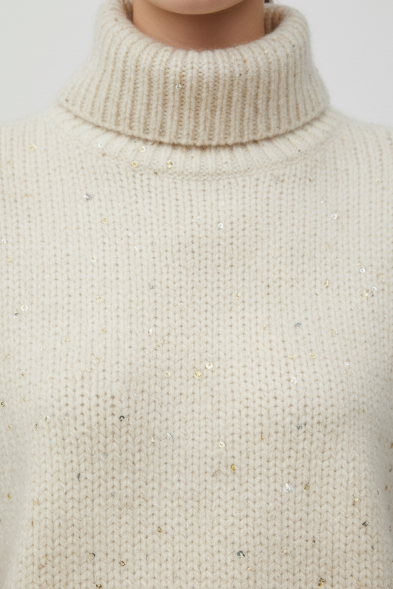 La maglia a collo alto con paillettes è l'ideale per chi cerca comfort e stile. Realizzata con una miscela di lana e poliestere, è perfetta per le giornate più fresche.