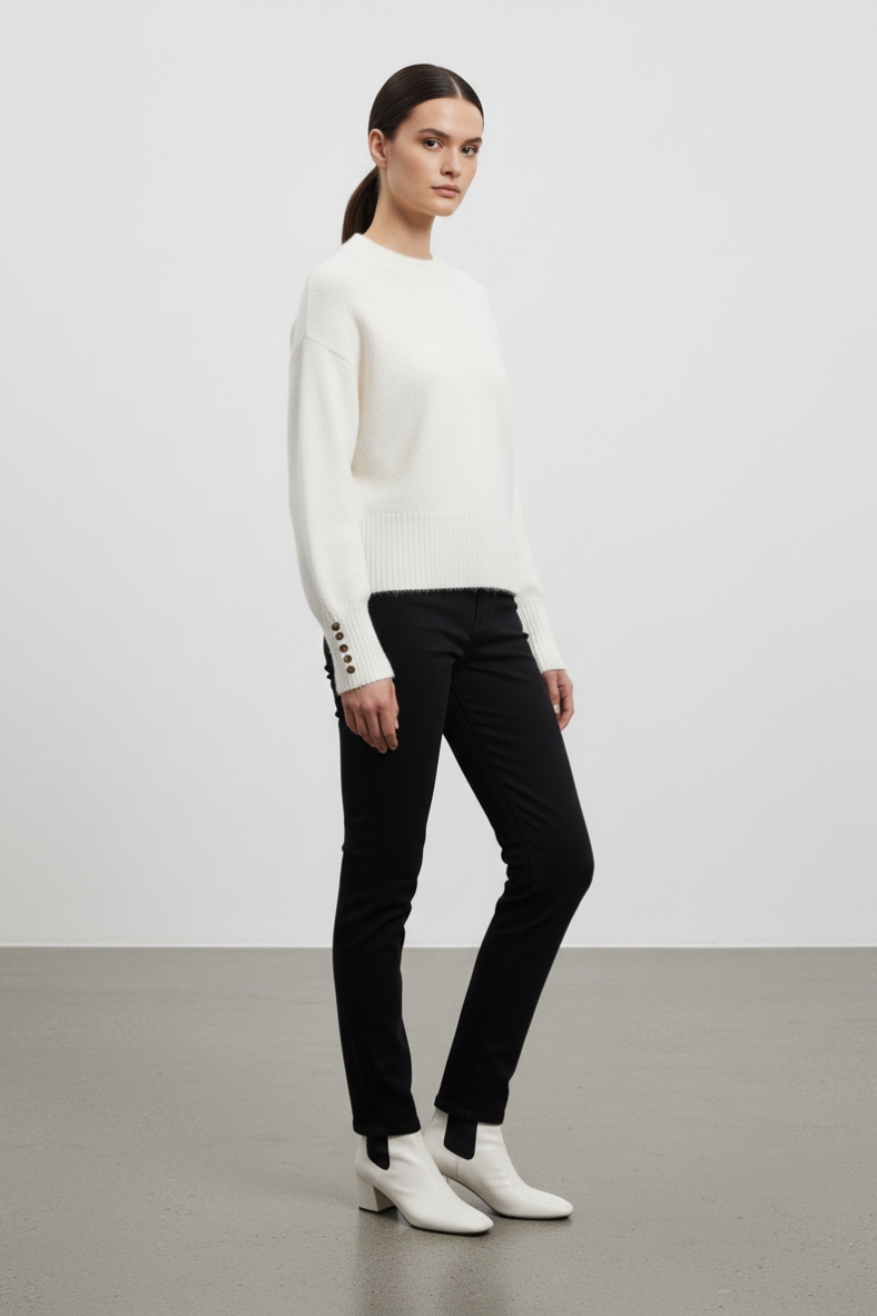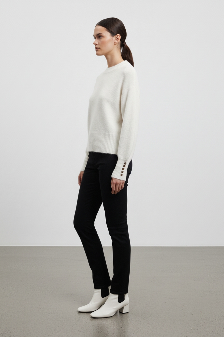 La maglia oversize con maniche a sbuffo e bottoni ai polsini è il capo ideale per un look casual e chic. Realizzata in un morbido mix di lana e Tencel, assicura comfort e calore durante le giornate più fresche.