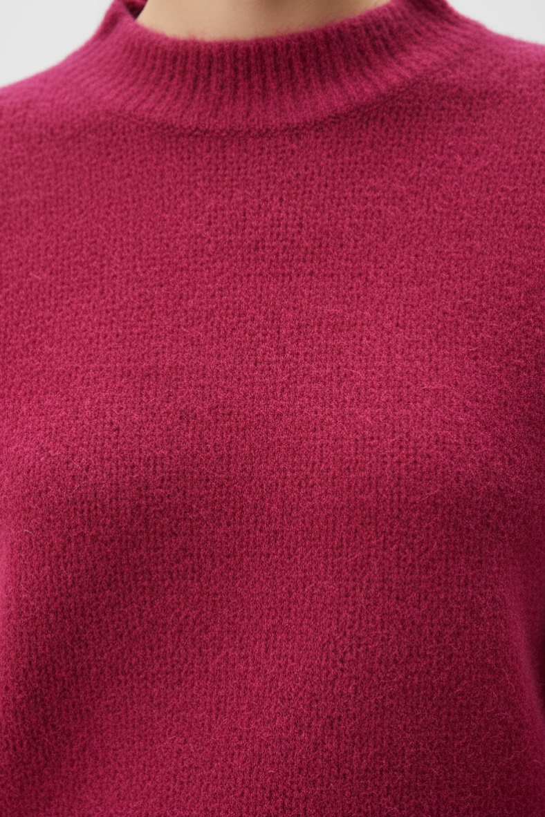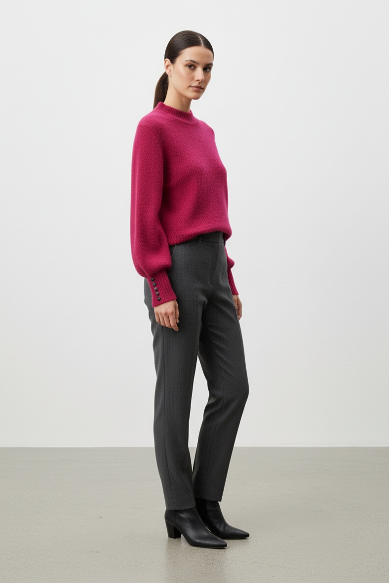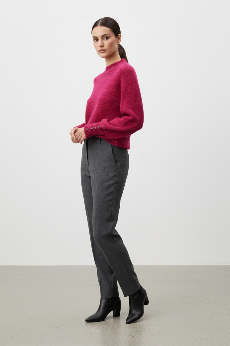 La maglia è disponibile in un vivace colore fucsia, perfetto per ravvivare le giornate grigie dell’inverno. I dettagli costruttivi, come il collo alto e le maniche con polsini a costine, aggiungono un tocco di originalità e comfort. Non dimenticare di accessoriare il tuo look con una sciarpa in cashmere per un ulteriore strato di calore e stile. Questa maglia è la scelta ideale per chi cerca un equilibrio tra comfort e moda, rendendola un capo versatile da avere nel proprio armadio.