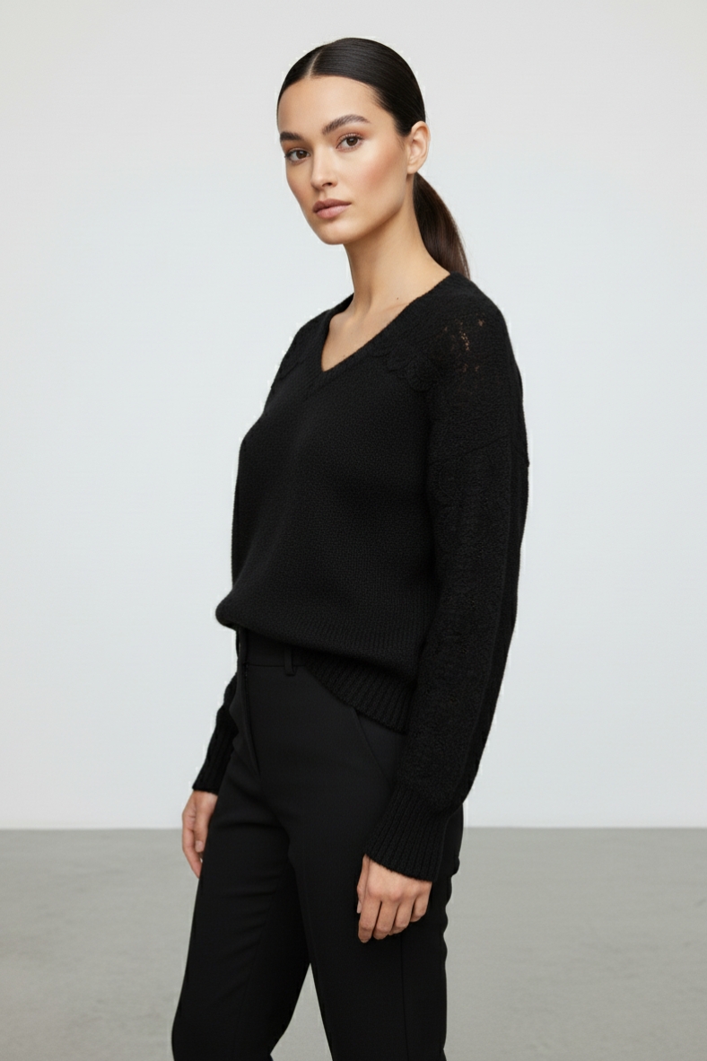 La maglia con scollo a V è un capo versatile che non può mancare nel tuo guardaroba autunnale. Realizzata con un caldo mix di materiali, questa maglia offre una sensazione di morbidezza al tatto, perfetta per affrontare le temperature più fresche. Il suo design elegante è arricchito da dettagli raffinati, come le lavorazioni a rilievo sulle spalle, che conferiscono un tocco di originalità e femminilità.