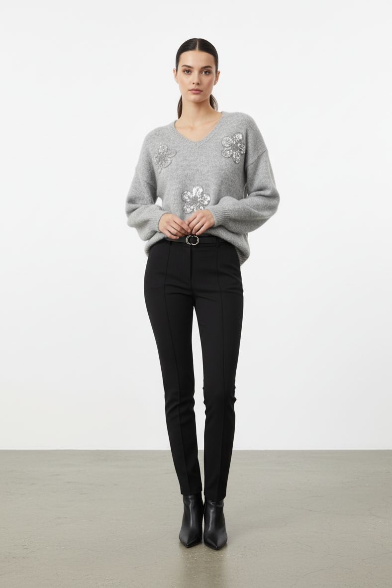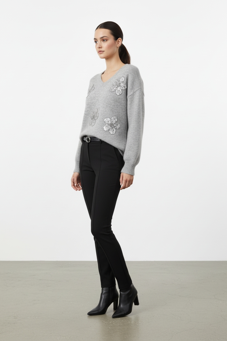 Questa maglia con fiori in paillettes è l'aggiunta perfetta al tuo guardaroba autunnale. Realizzata con un mix di materiali di alta qualità, garantisce comfort e stile in ogni occasione.