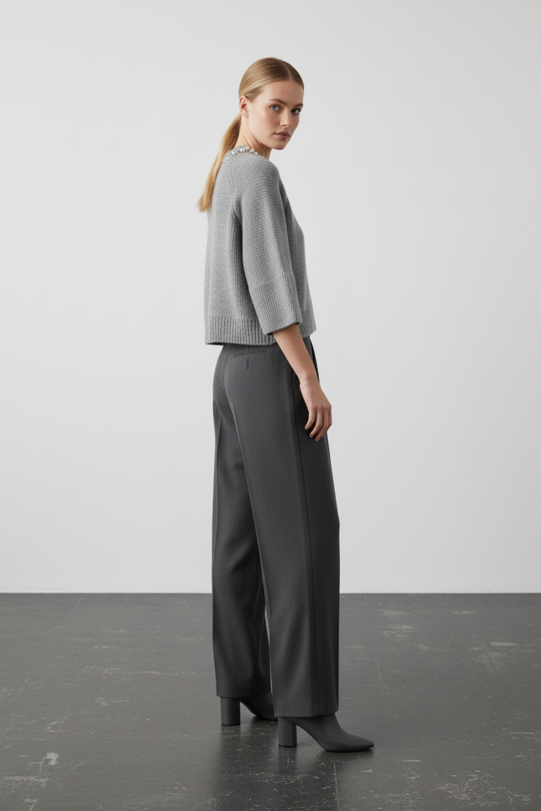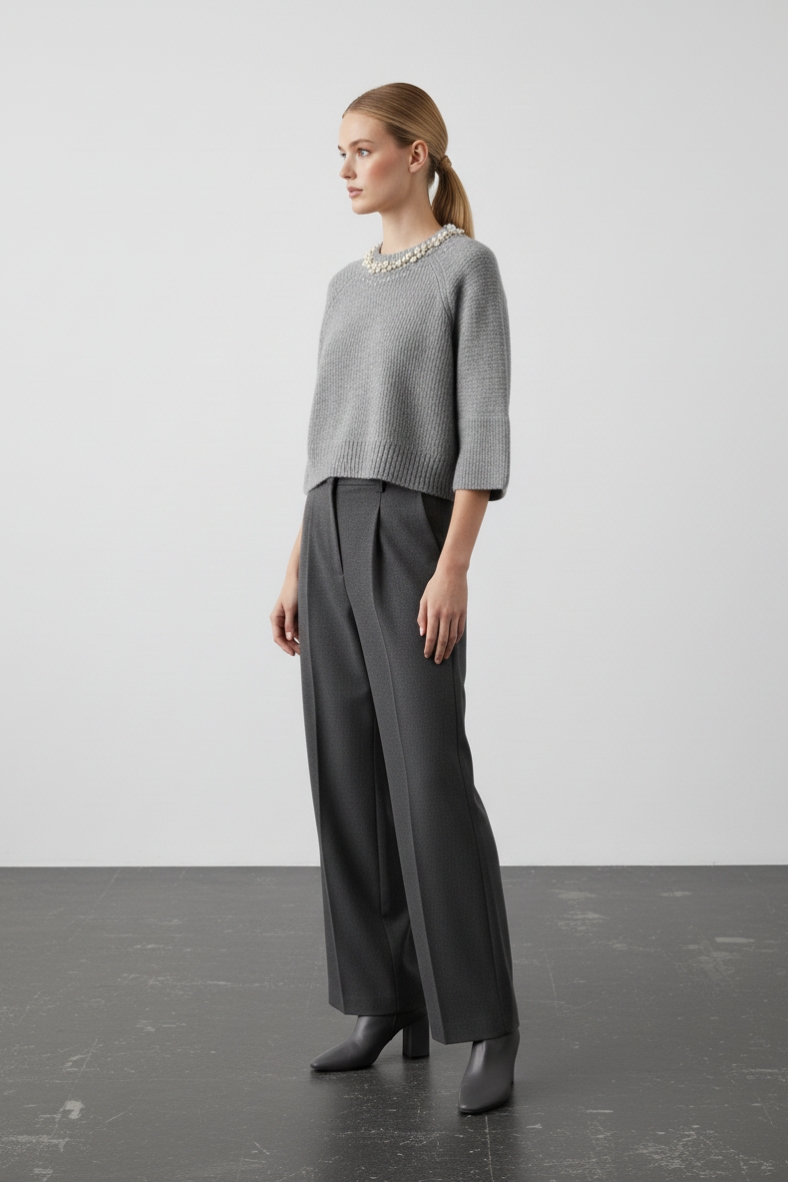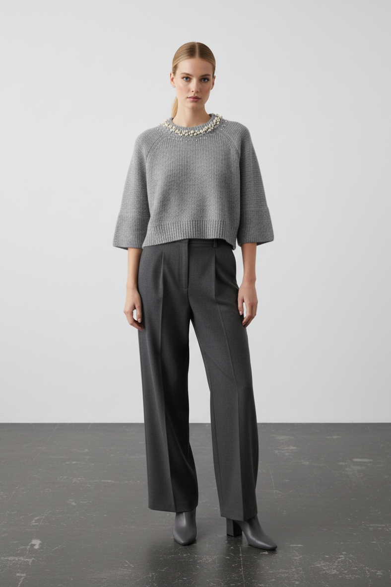Un elemento distintivo di questa maglia è il colletto decorato con perline, che aggiunge un tocco di eleganza e raffinatezza. Puoi abbinarla facilmente a pantaloni a palazzo per un look chic da ufficio o a jeans skinny per un’uscita informale con le amiche. Per un tocco di classe, completa il tuo outfit con stivaletti in pelle e una borsa a tracolla.