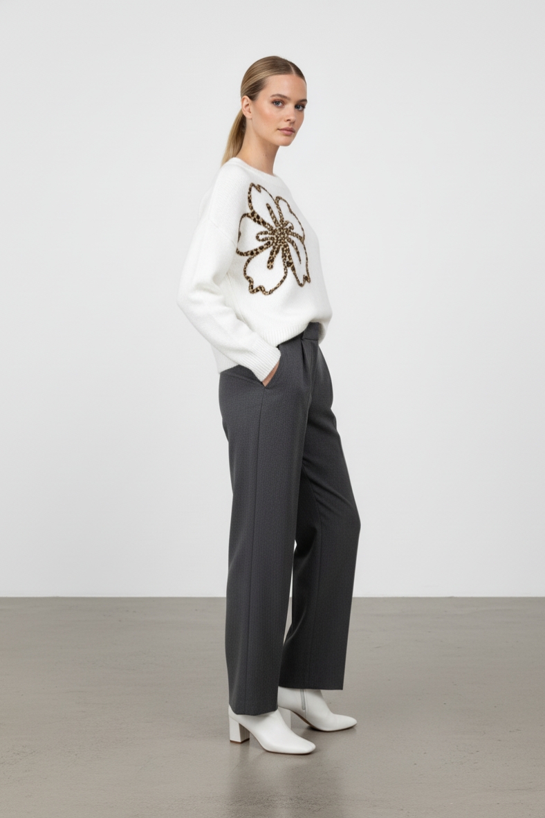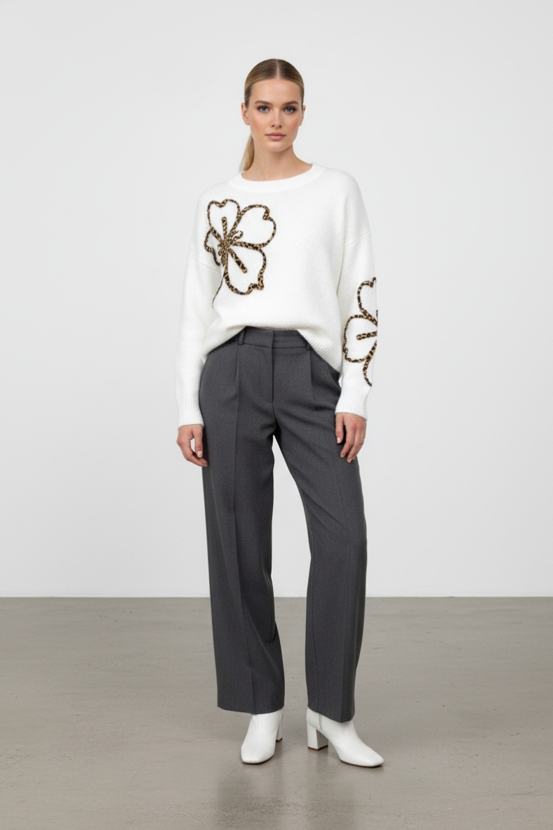 Questa maglia con fiore leopardato è l'aggiunta perfetta al tuo guardaroba. Realizzata in un mix di lana e poliestere, offre calore e comfort senza compromettere lo stile.