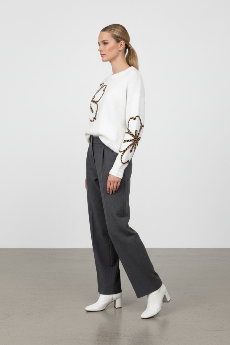 La maglia con con fiore leopardato è un must-have per chi desidera unire eleganza e comfort nel proprio look autunnale. Realizzata con una composizione di lana e poliestere, questa maglia offre una sensazione di morbidezza al tatto, perfetta per le giornate più fresche. I dettagli floreali ricamati sulle maniche donano un tocco di originalità e femminilità, rendendo questo capo ideale per ogni occasione, dal lavoro a un’uscita serale.