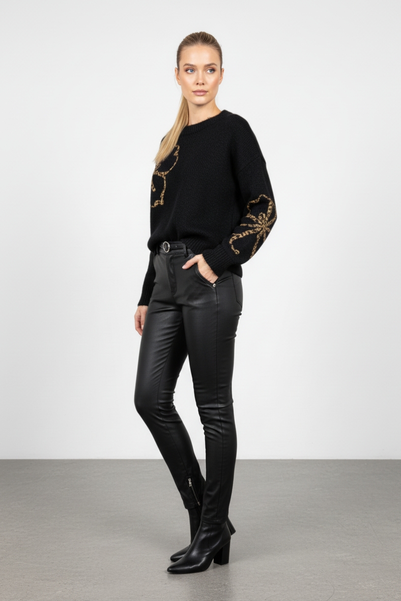 La maglia con fiore leopardato è l’elemento chiave per un look casual ma sofisticato. Caratterizzata da un morbido tessuto che avvolge delicatamente il corpo, questa maglia è realizzata in una miscela di lana e poliestere, garantendo calore e comfort durante le fresche giornate autunnali. Il suo design presenta un elegante ricamo che aggiunge un tocco di originalità e stile, rendendola perfetta per ogni occasione.