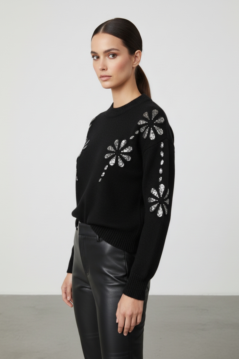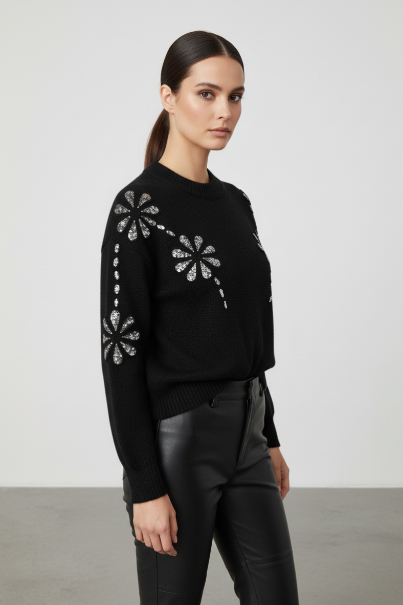 Per un look sofisticato, prova ad indossarla con un paio di pantaloni a palazzo in tessuto grigio, creando un contrasto elegante che mette in risalto i ricami della maglia. Completa il tuo outfit con un paio di stivaletti in pelle e una borsa a tracolla per un tocco di classe. Se desideri un look più casual, abbinala a jeans skinny e sneakers bianche per un’uscita informale con stile.