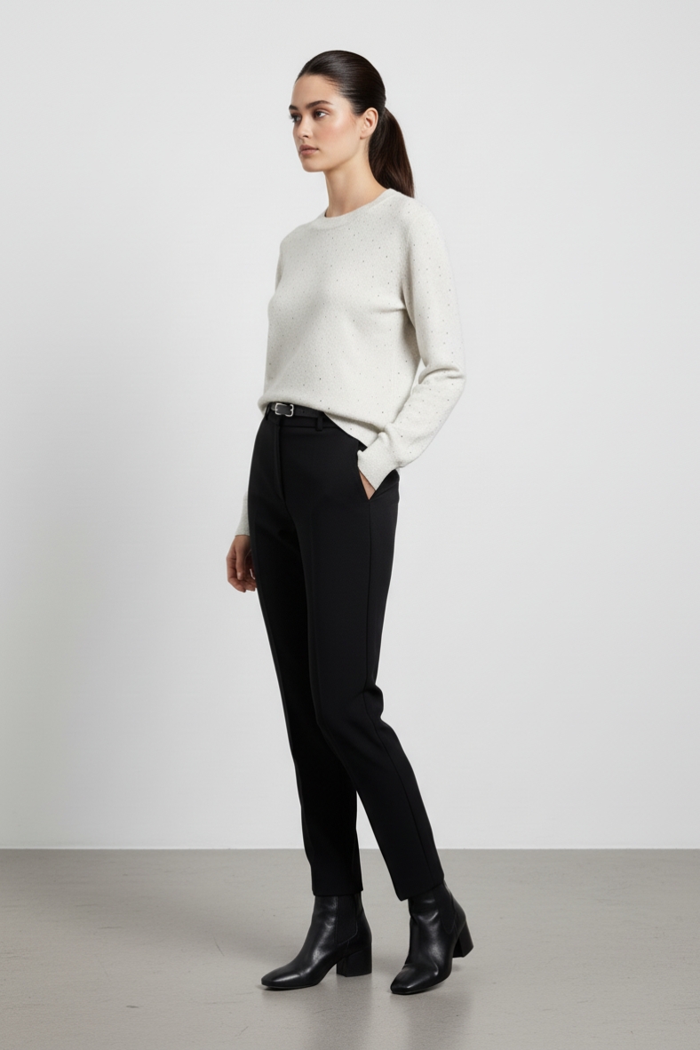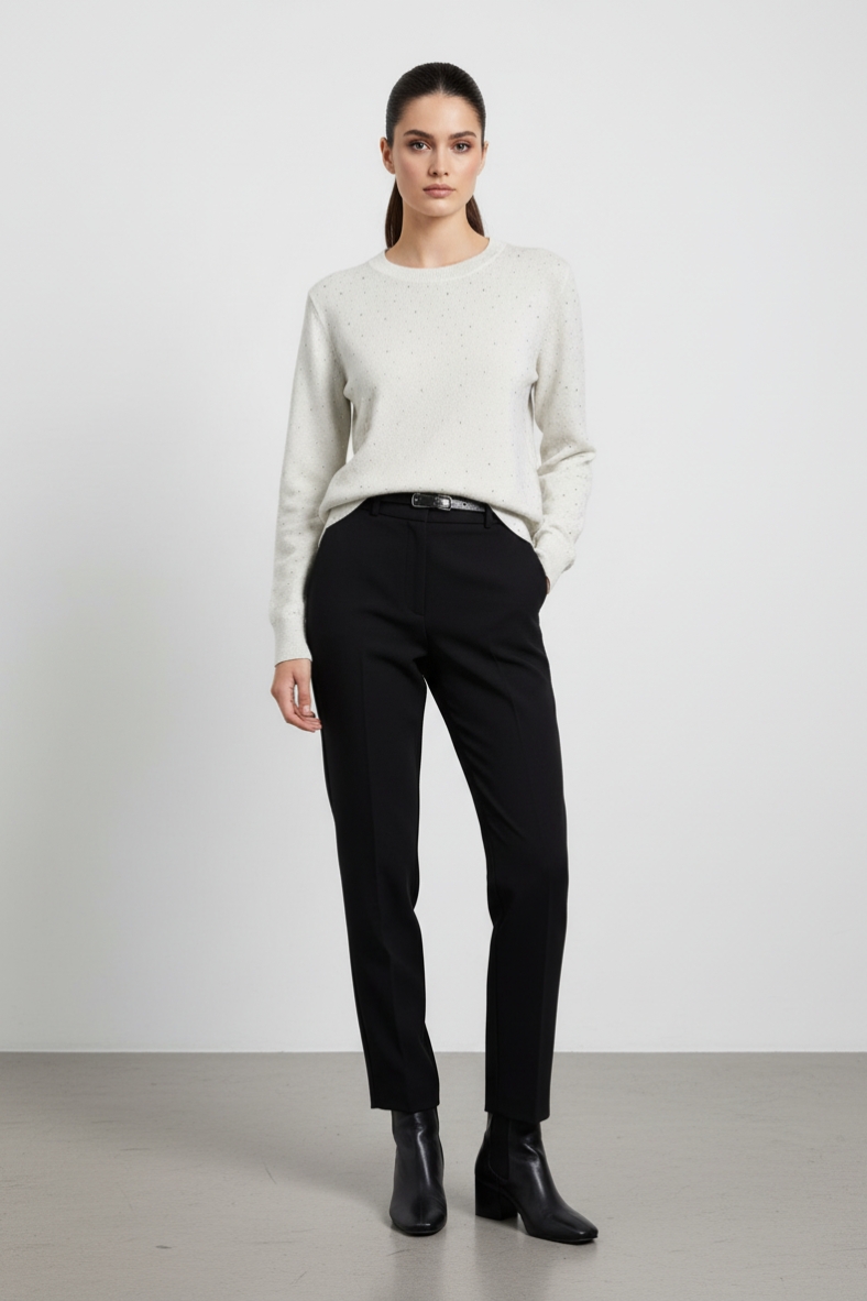Abbinata a un paio di pantaloni neri slim fit, questa maglia crea un outfit sofisticato e moderno. Per un tocco di eleganza in più, puoi completare il look con un blazer strutturato e stivaletti in pelle. Non dimenticare di accessoriare con gioielli minimalisti per esaltare i dettagli scintillanti della maglia.