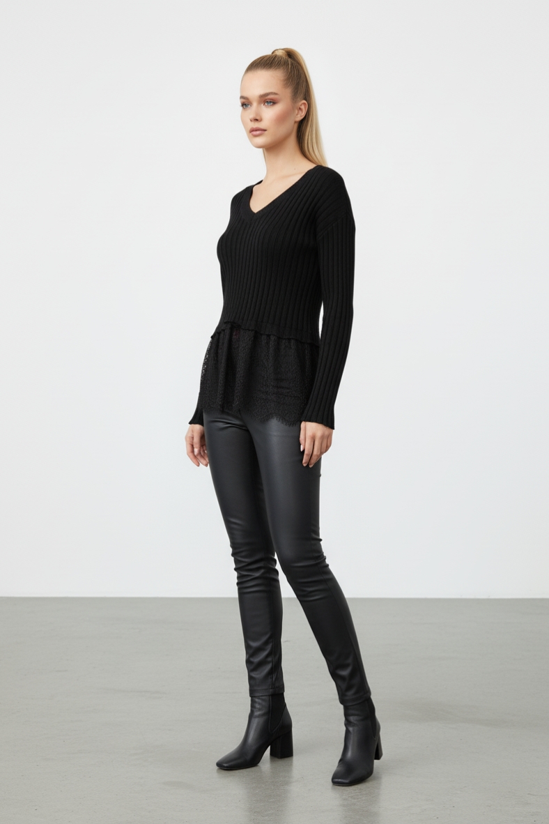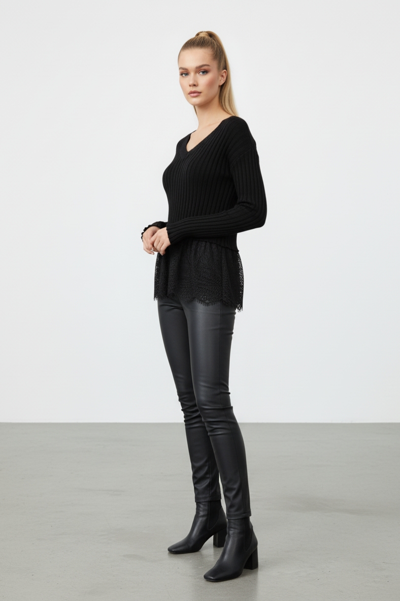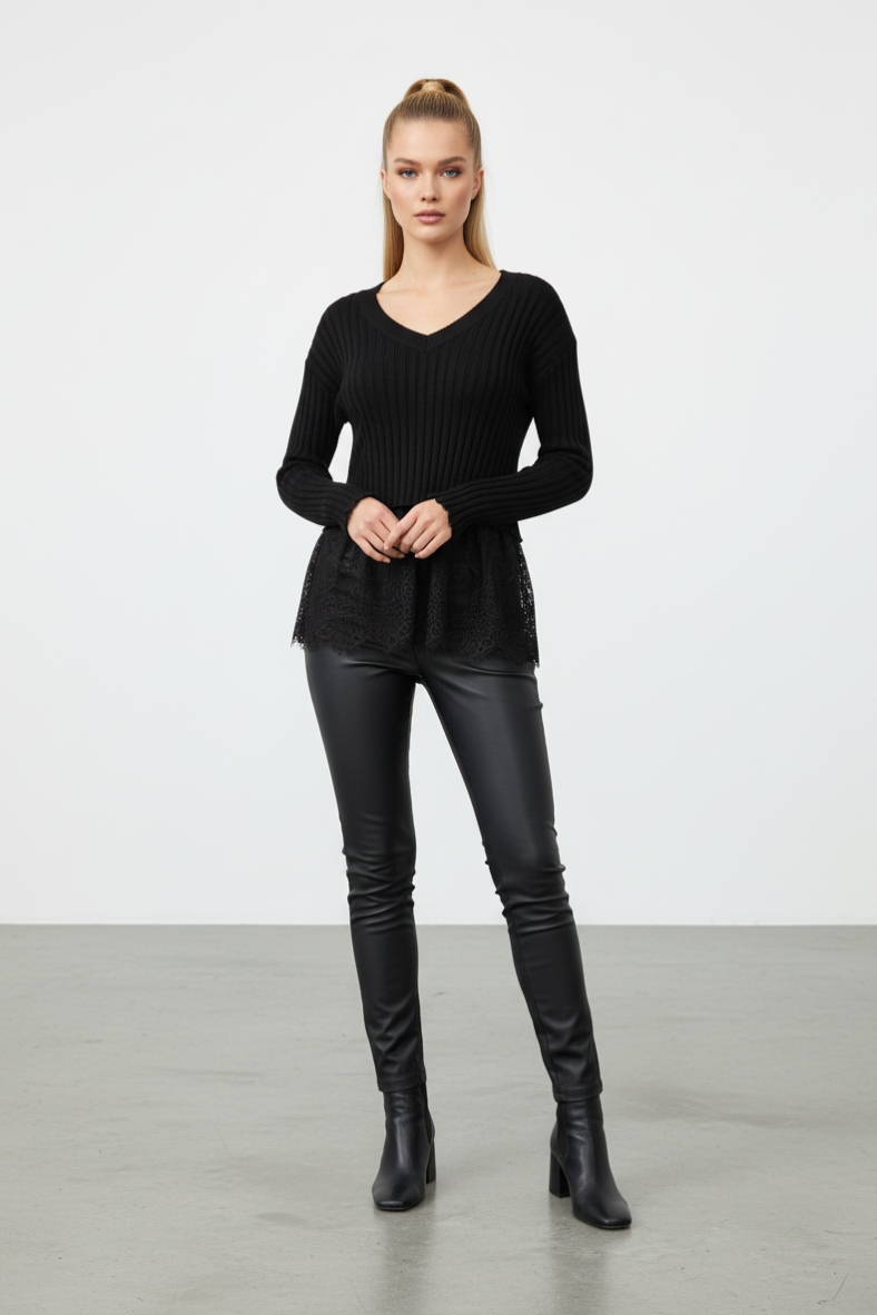 La maglia due pezzi con canottiera in pizzo è un capo versatile e chic, ideale per le serate invernali. Realizzata in morbida viscosa, offre un comfort eccezionale e un look elegante.