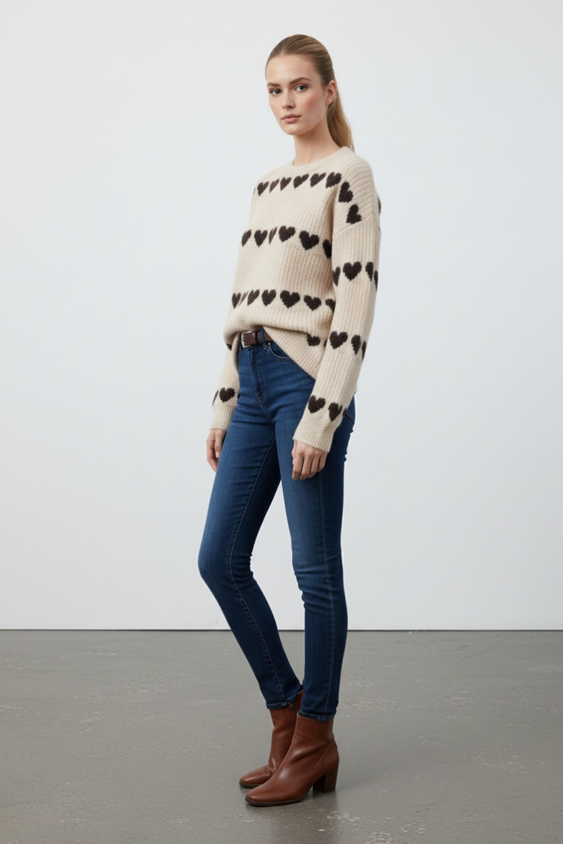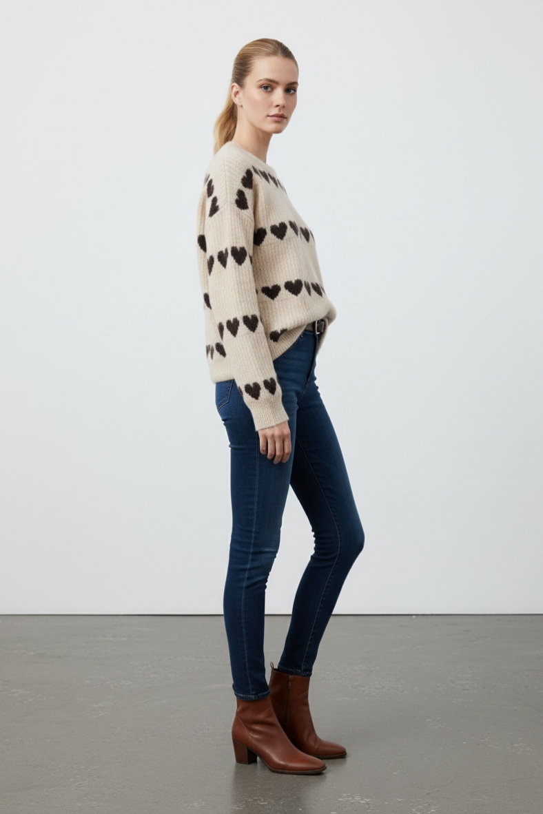 La maglia con cuori trendy è l'ideale per chi cerca comfort e stile. Realizzata in morbida viscosa e lana, è perfetta per le giornate più fresche.