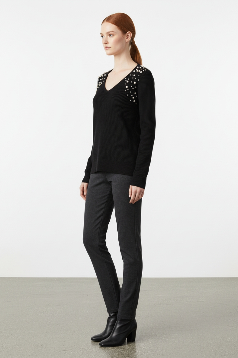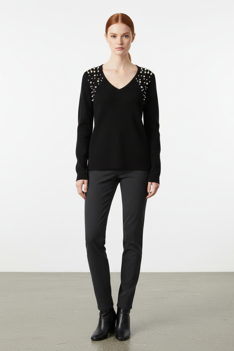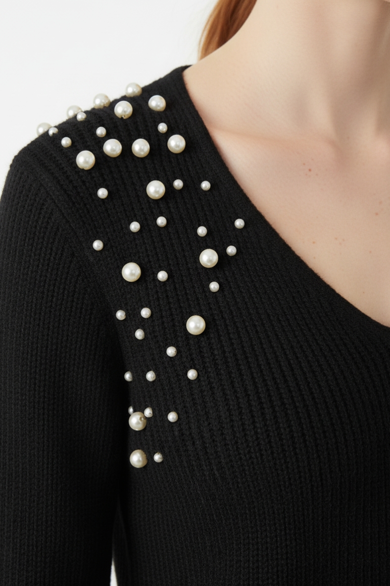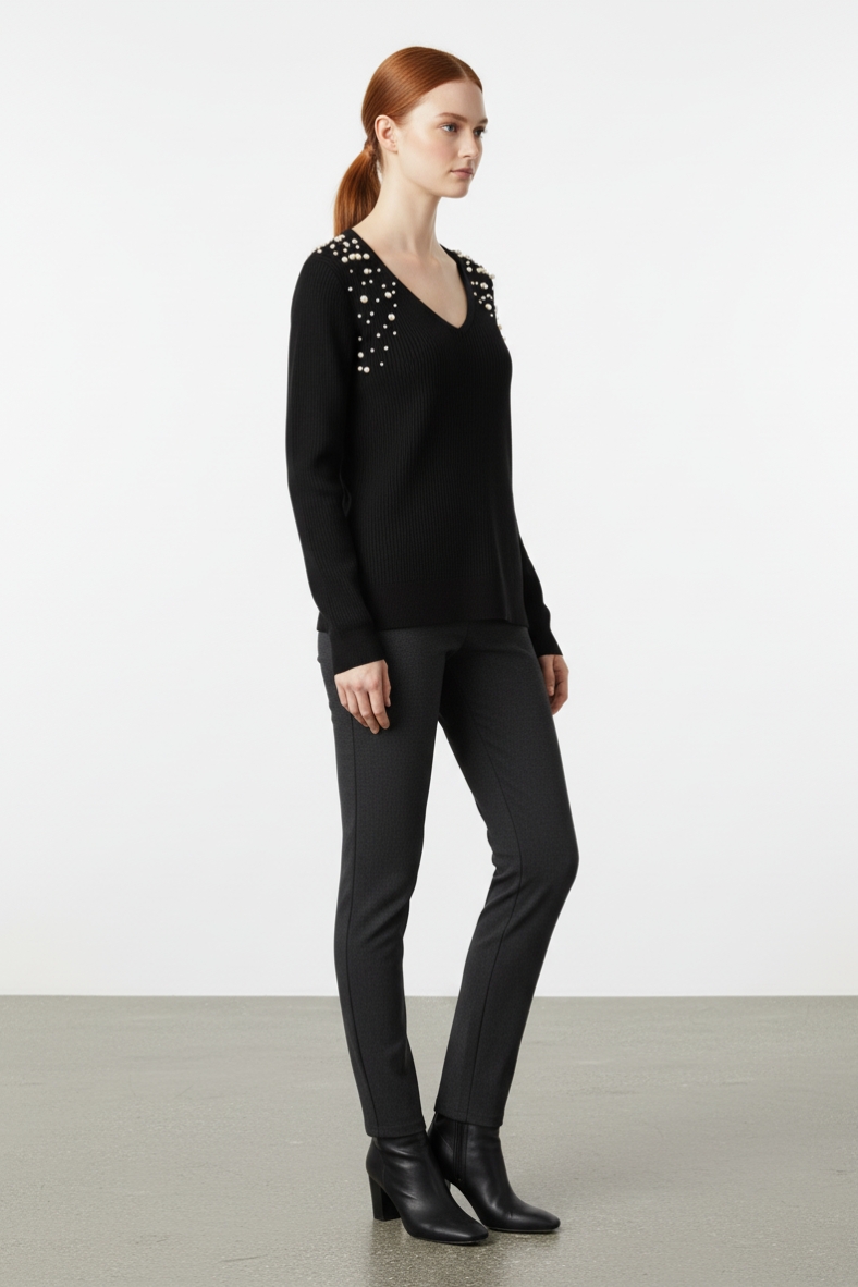 La maglia con dettagli brillanti è un must-have per la stagione autunnale. Realizzata in morbida viscosa, questa maglia offre una vestibilità comoda e un tocco di lusso grazie ai suoi dettagli scintillanti sulle spalle. Il suo scollo a V valorizza il décolleté, rendendola ideale per essere indossata sia in occasioni casual che più formali. La texture a coste conferisce un aspetto sofisticato, mentre il colore nero la rende estremamente versatile.
