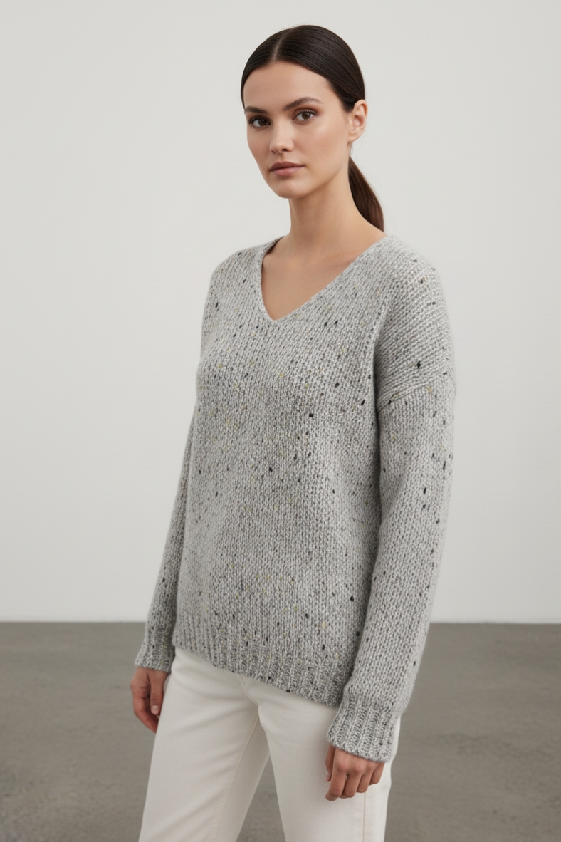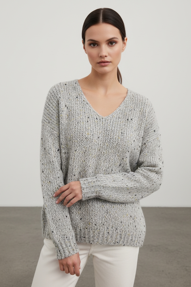 Per un look sofisticato, prova ad abbinarla a un paio di pantaloni tailored grigi e stivaletti in pelle. Se desideri un outfit più casual, puoi indossarla con jeans skinny e sneakers bianche. La maglia presenta un delicato scollo a V che mette in risalto il collo, mentre le maniche lunghe offrono una copertura ideale per le giornate più fresche.