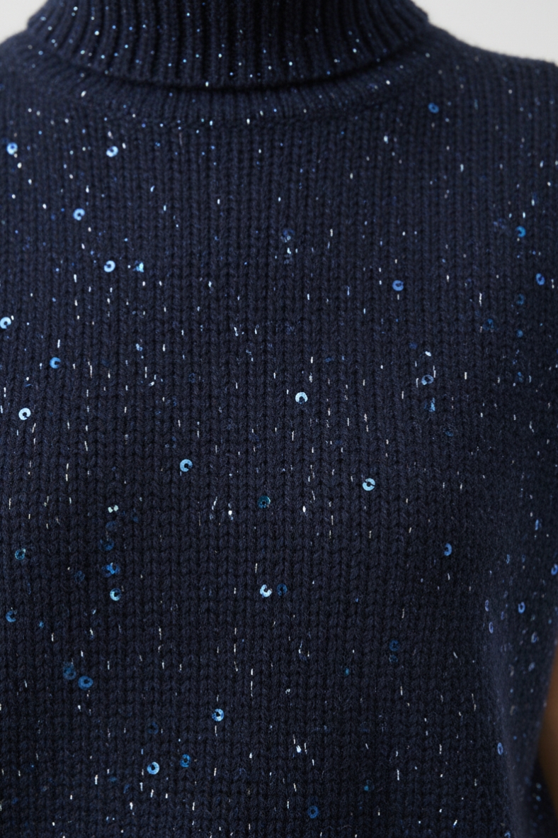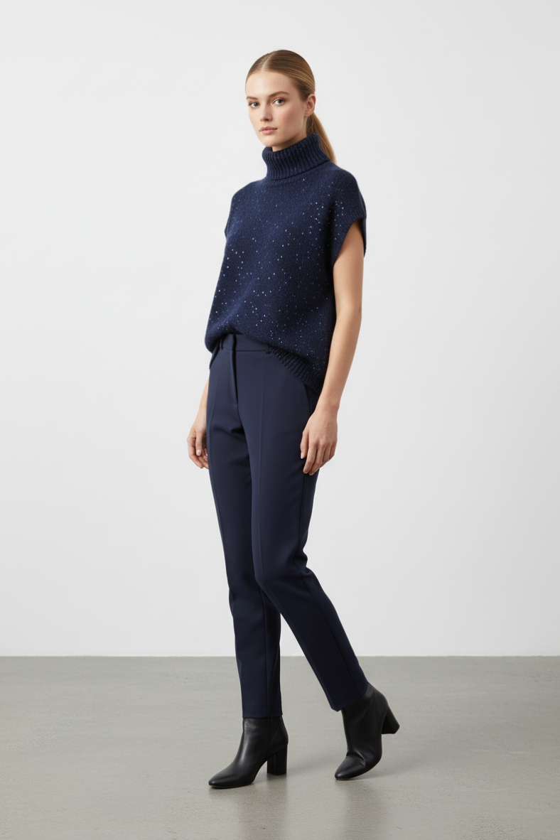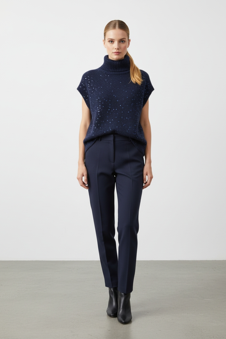Il collo alto non solo aggiunge un tocco di sofisticatezza, ma offre anche una protezione extra dal freddo. I dettagli luminosi, come le piccole paillettes, donano un tocco di brillantezza, rendendo questa maglia ideale per le serate più speciali. Puoi abbinarla a pantaloni eleganti per un look da ufficio impeccabile o a jeans skinny per un’uscita informale con amici.