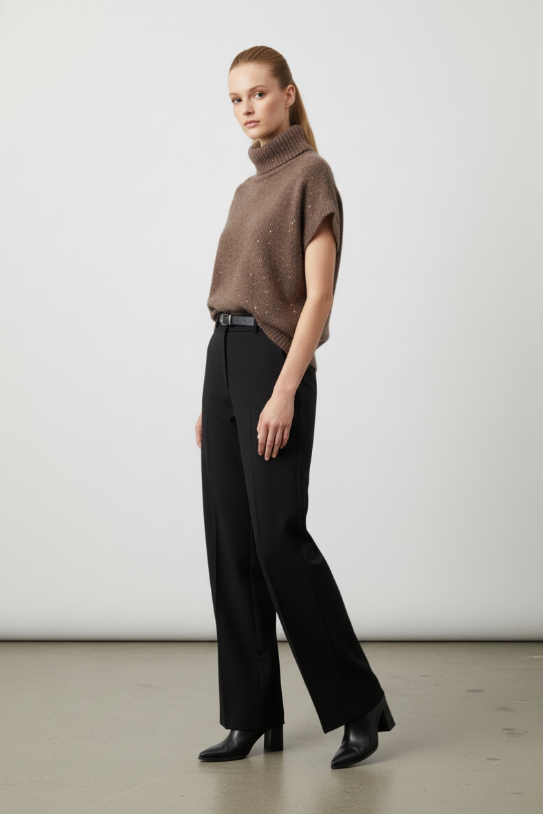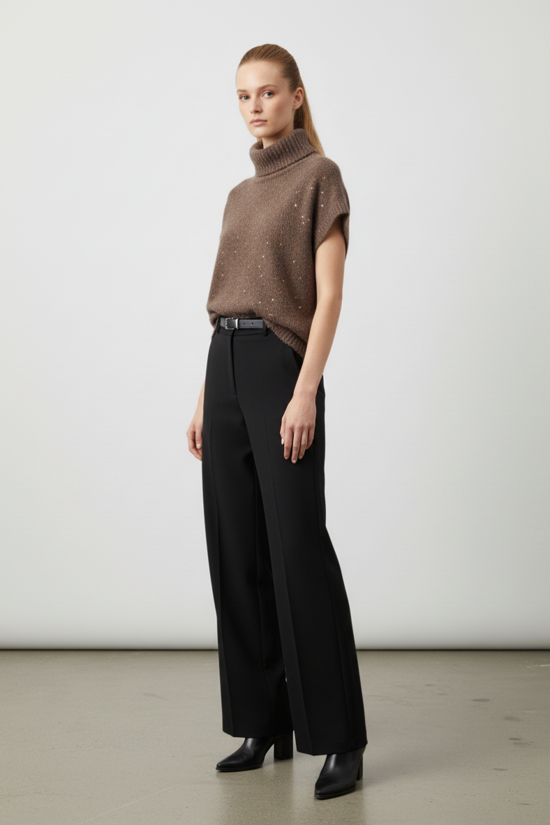 La maglia smanicata con collo alto è un must-have per la stagione. Realizzata con una miscela di lana e poliestere, offre calore e comfort senza rinunciare allo stile. Perfetta per ogni occasione.
