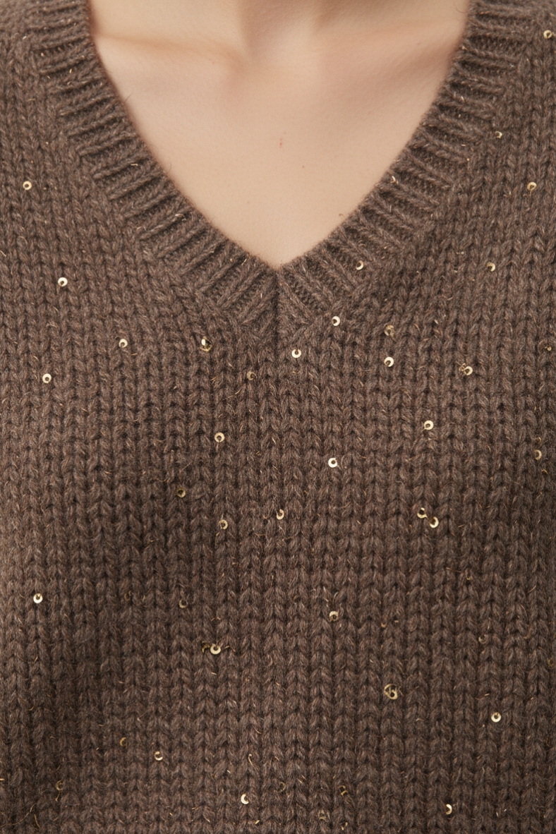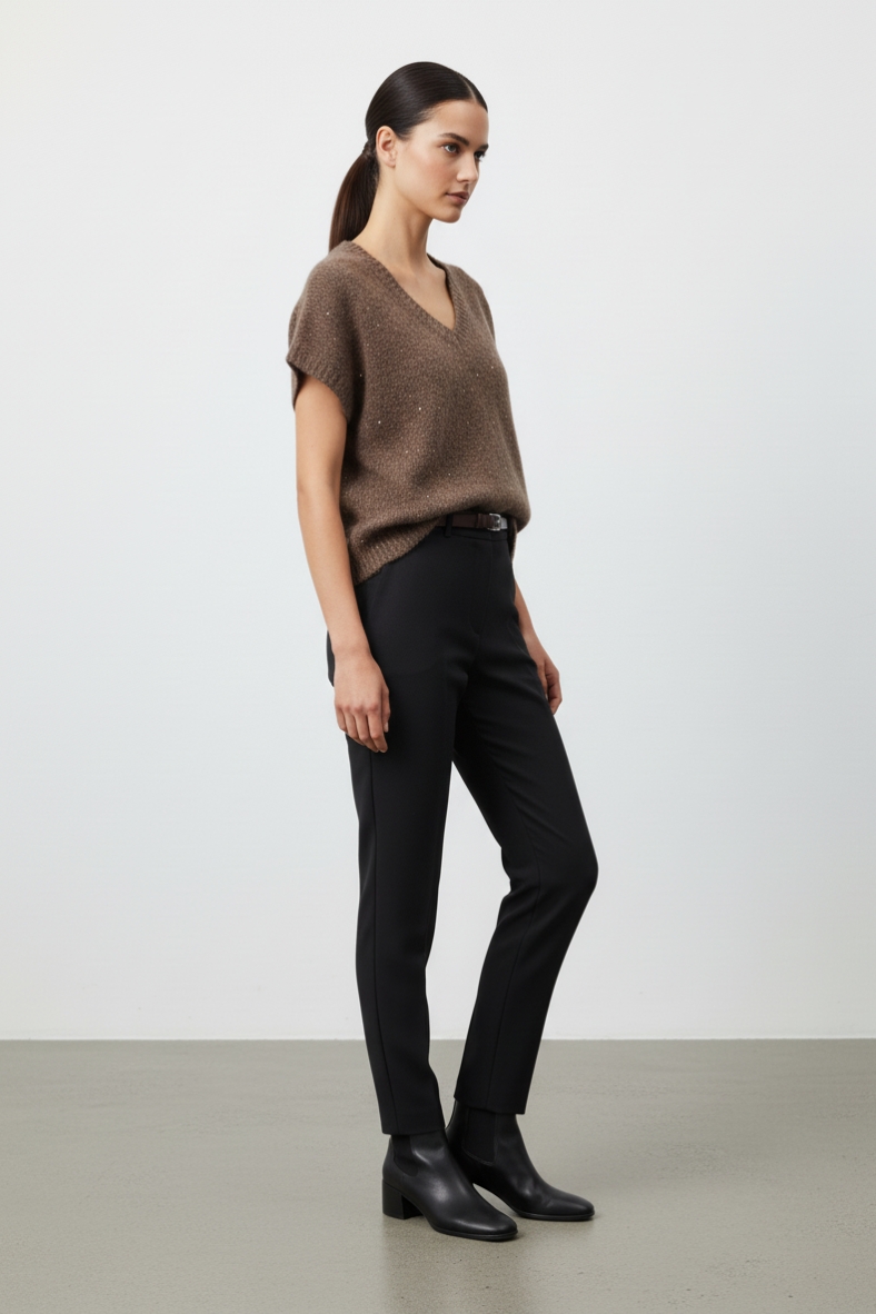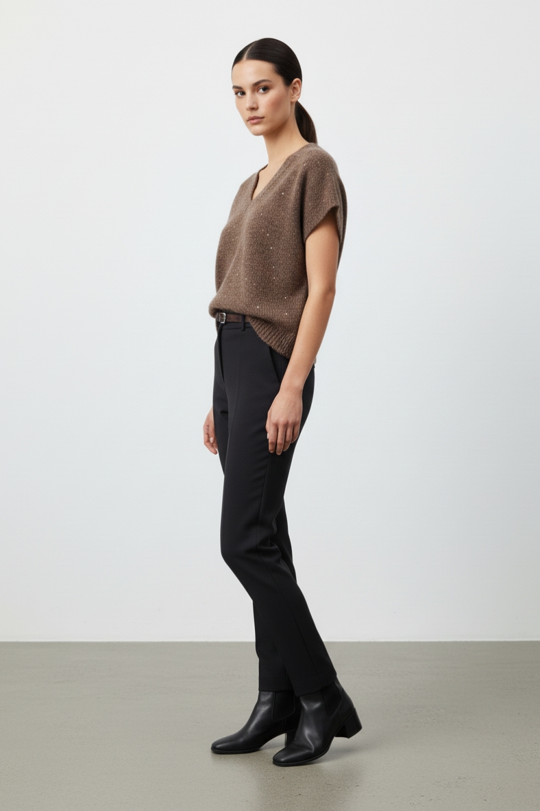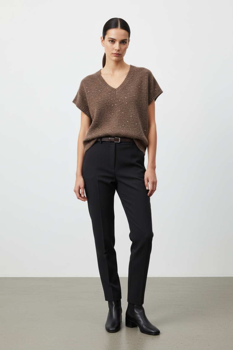 Puoi indossarla con un paio di pantaloni slim fit per un look sofisticato da ufficio, oppure abbinarla a jeans skinny per un’uscita informale con gli amici. La tonalità calda e neutra della maglia si sposa perfettamente con colori più scuri, rendendola versatile per ogni occasione. Per un tocco di classe, prova ad aggiungere una cintura in vita per definire la silhouette e creare un contrasto interessante.