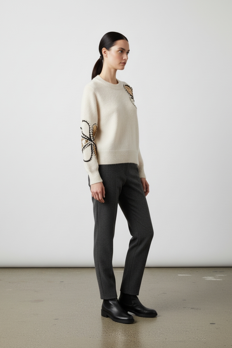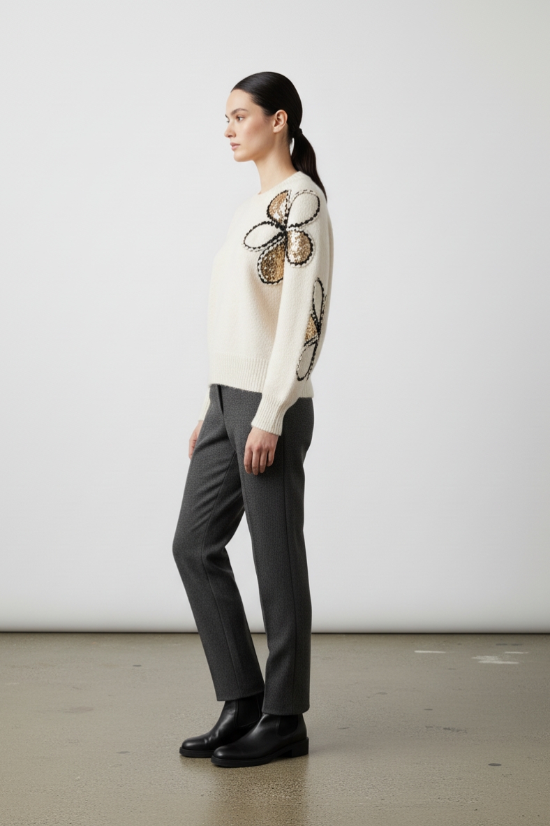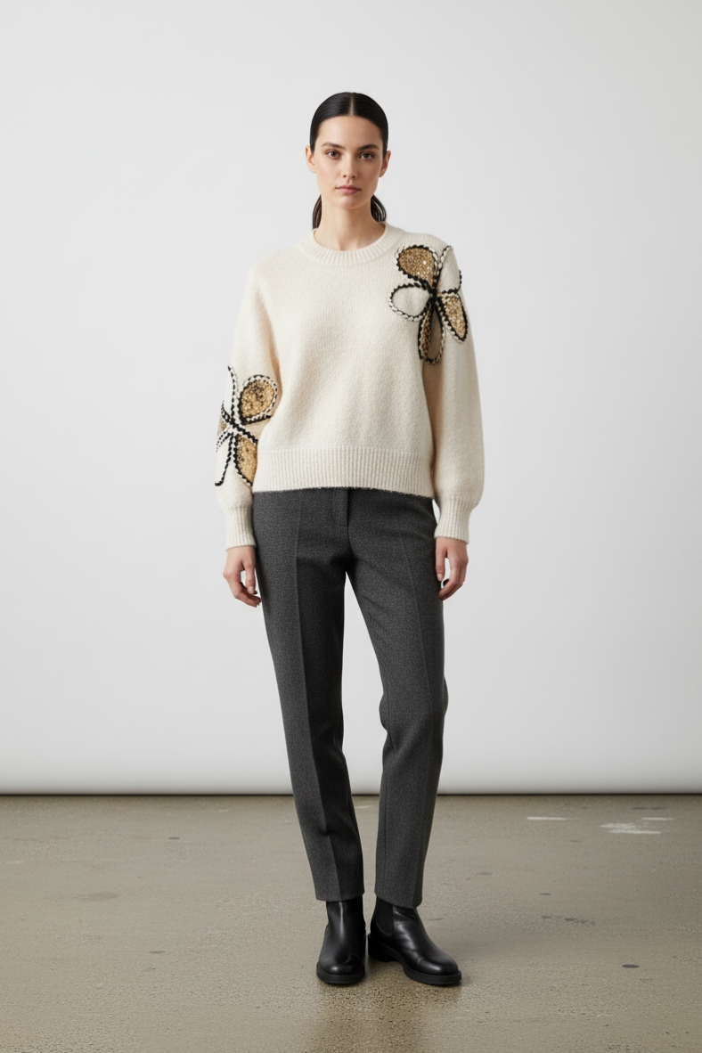 La maglia con dettagli floreali è un must-have per chi desidera unire comfort e stile. Realizzata con una morbida miscela di poliestere e lana, questa maglia presenta un design elegante e contemporaneo, arricchito da fiori ricamati che donano un tocco di originalità. La vestibilità regolare la rende perfetta per ogni silhouette, mentre il suo colore neutro la rende facilmente abbinabile. Indossala con pantaloni a sigaretta per un look sofisticato o con jeans per un outfit casual-chic. Gli stivaletti in pelle completano il look, aggiungendo un tocco di classe. Perfetta per le giornate più fresche, questa maglia è ideale anche per essere indossata sopra una camicia bianca per un effetto stratificato. Non perdere l’occasione di aggiungere questo pezzo versatile al tuo guardaroba: è il capo ideale per ogni occasione, dal lavoro al tempo libero. Scegli la qualità e lo stile con questa maglia che non passerà inosservata.