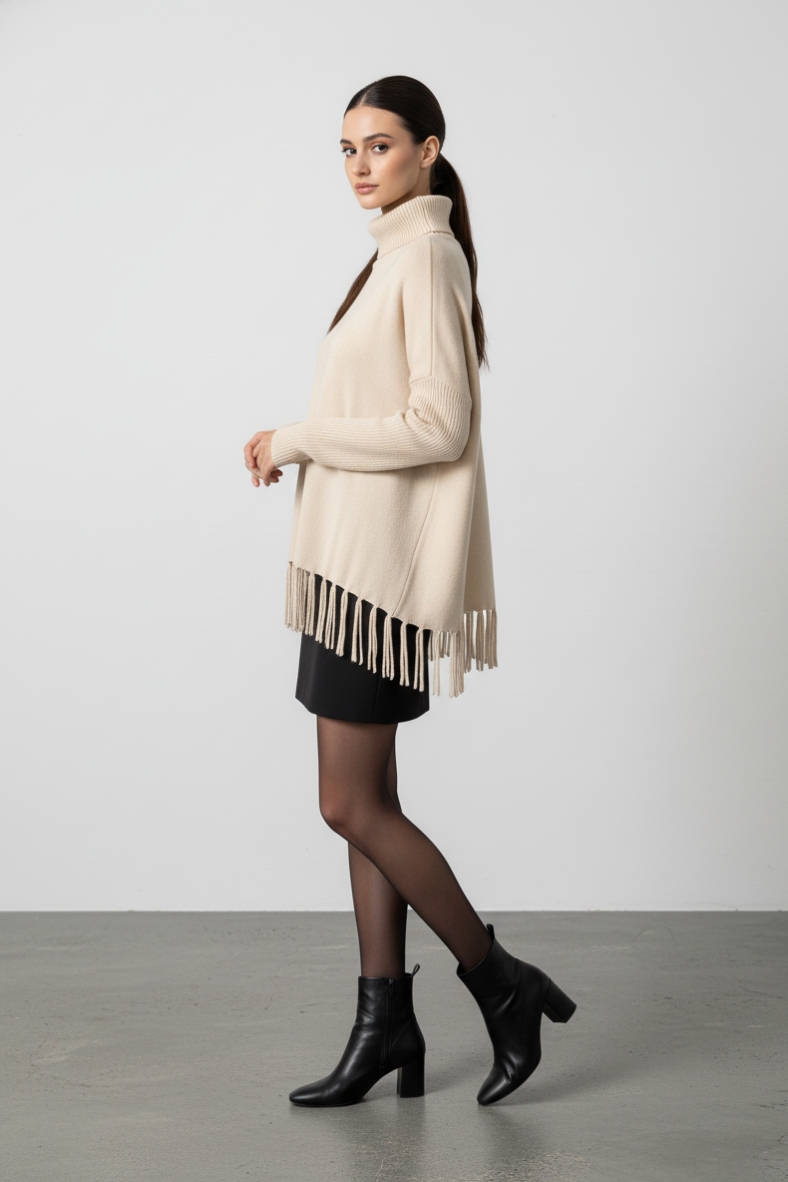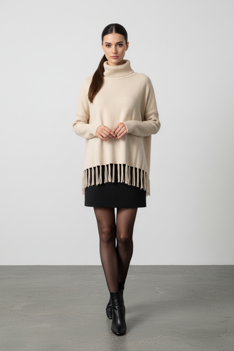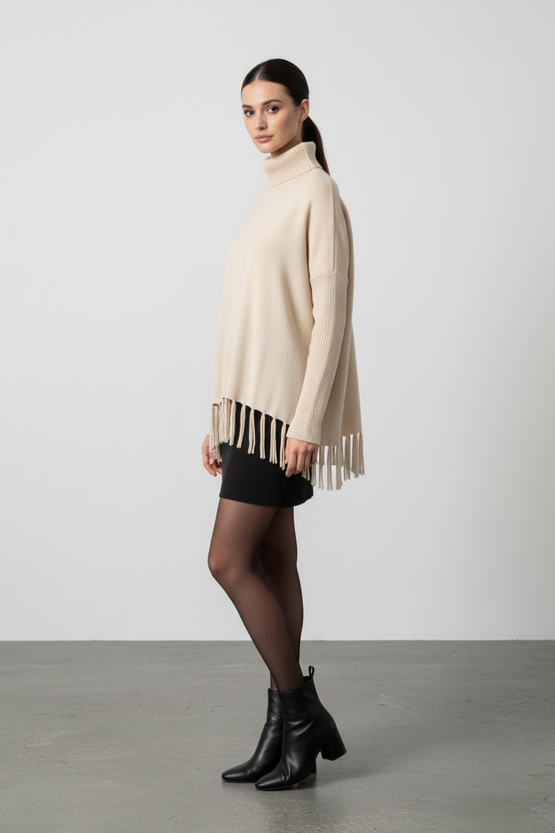 La maglia over con frange trendy è il must-have di questa stagione, un capo che unisce comfort e stile in un’unica soluzione. Realizzata con un mix di acrilico e viscosa, questa maglia è incredibilmente morbida al tatto, avvolgendo il corpo in un abbraccio caldo e accogliente. Il suo design presenta un collo alto che non solo aggiunge un tocco di eleganza, ma offre anche una protezione extra dal freddo. Le frange sul fondo, poi, conferiscono un movimento dinamico al capo, rendendolo perfetto per chi ama distinguersi con dettagli unici.