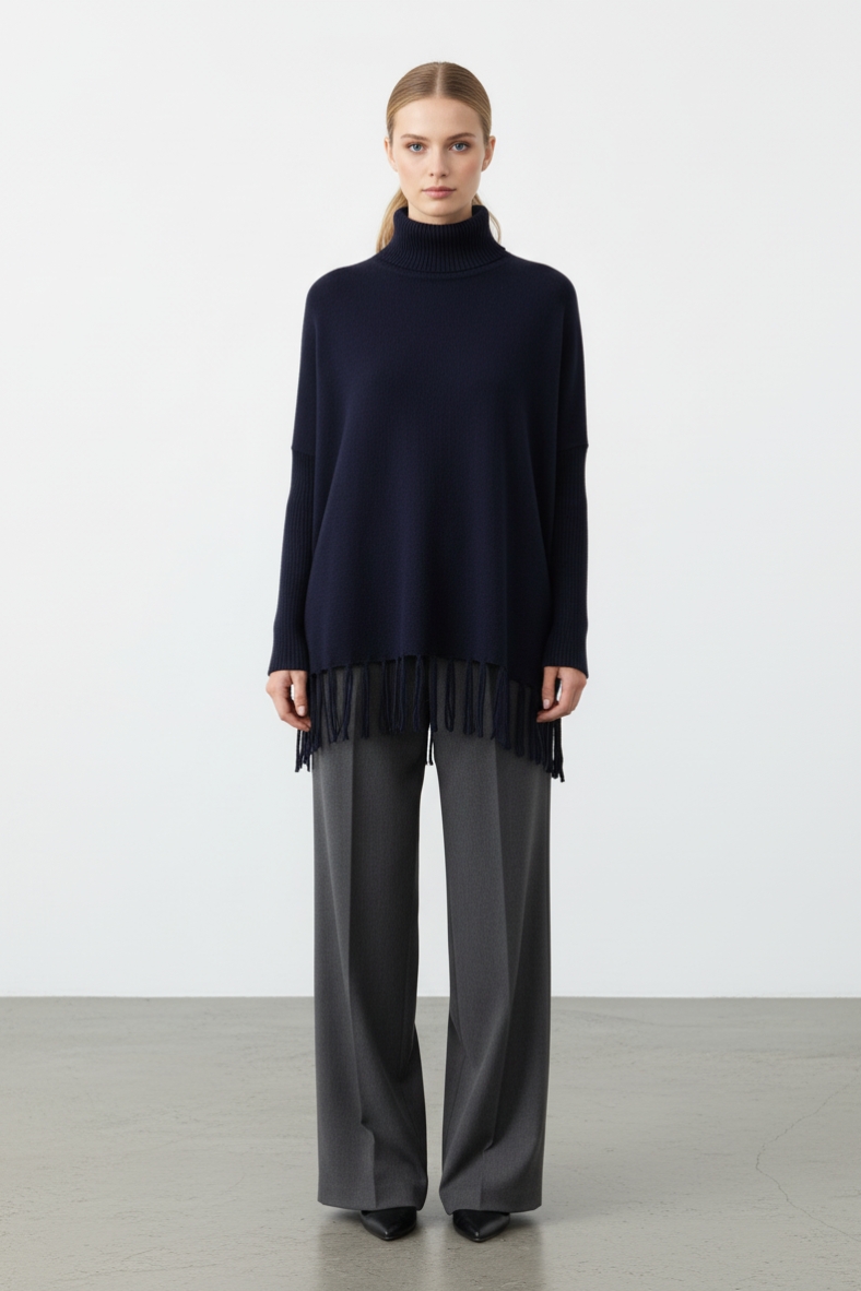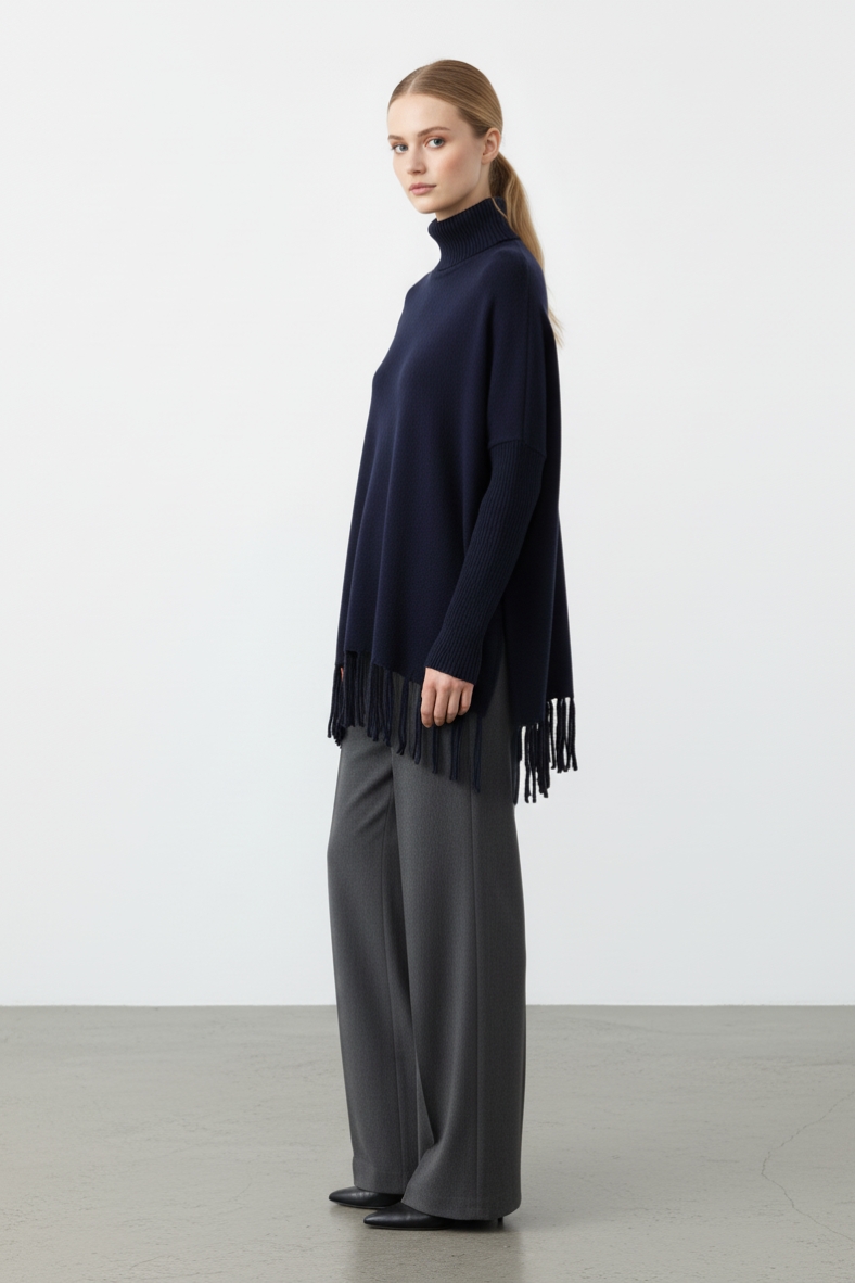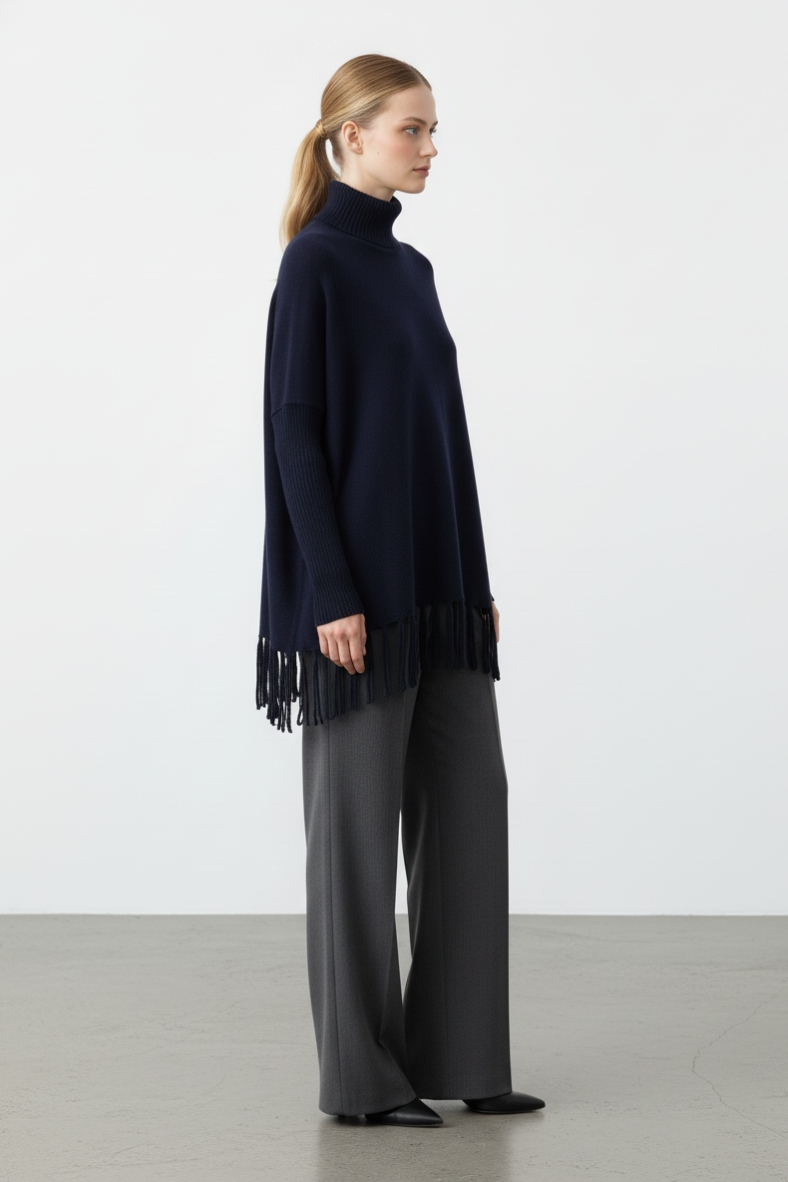 La maglia over con frange trendy è il must-have di questa stagione, un capo che unisce comfort e stile in un’unica soluzione. Realizzata con un mix di acrilico e viscosa, questa maglia è incredibilmente morbida al tatto, avvolgendo il corpo in un abbraccio caldo e accogliente. Il suo design presenta un collo alto che non solo aggiunge un tocco di eleganza, ma offre anche una protezione extra dal freddo. Le frange sul fondo, poi, conferiscono un movimento dinamico al capo, rendendolo perfetto per chi ama distinguersi con dettagli unici.
