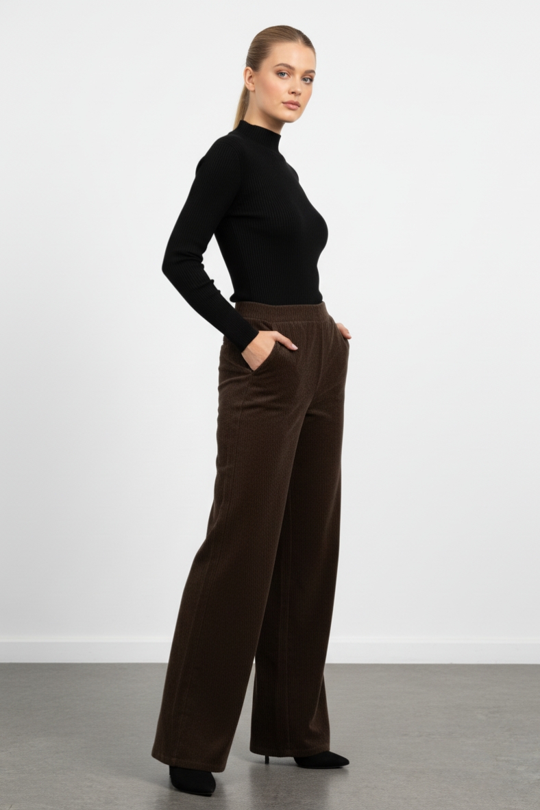 Il pantalone ampio in velluto è l'alleato perfetto per un look elegante e contemporaneo. Realizzato in poliestere, offre comfort e versatilità per ogni occasione.