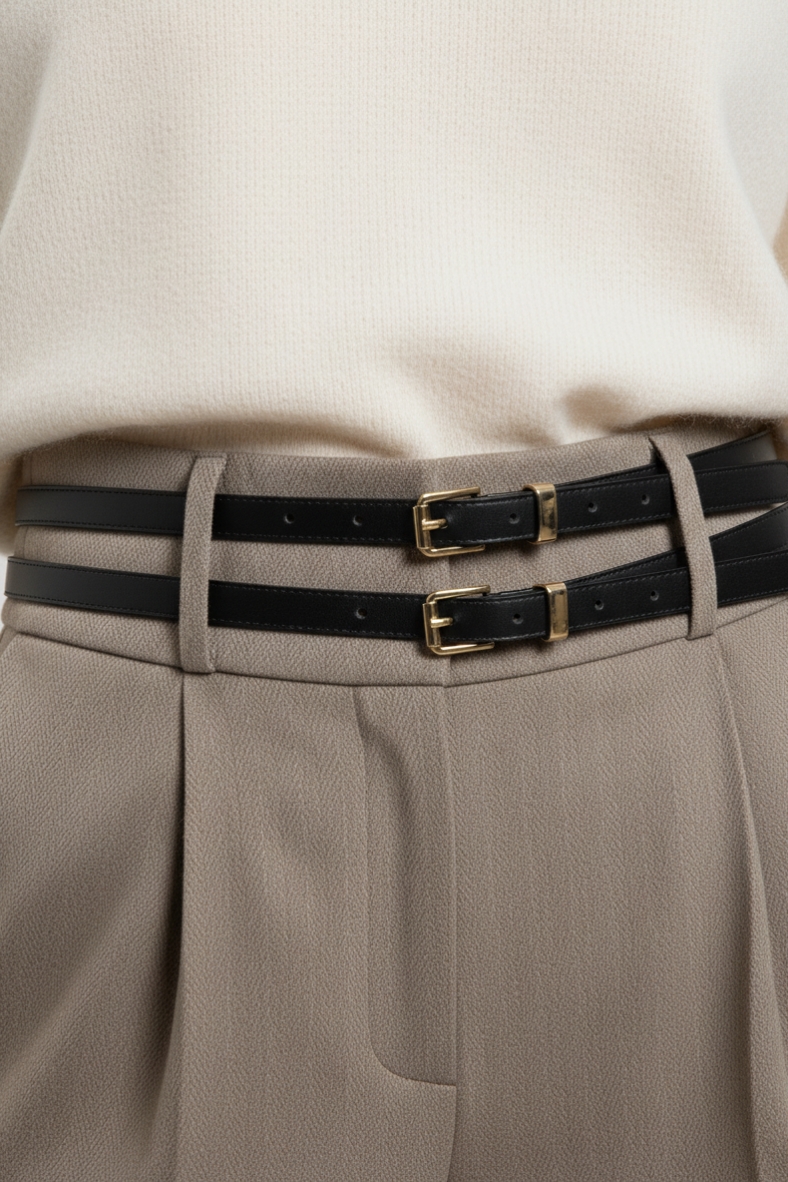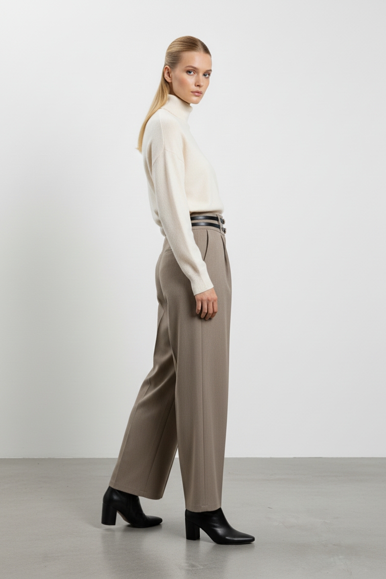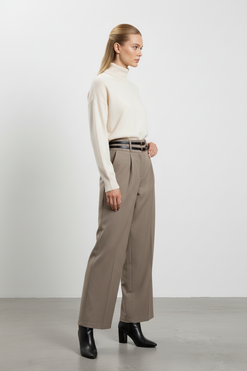 Caratterizzato da una vita alta e una cintura con doppia fibbia, questo pantalone esalta la figura e aggiunge un tocco di classe a qualsiasi outfit. La sua tonalità marrone scuro è facilmente abbinabile con una varietà di colori, rendendolo un elemento chiave nel tuo guardaroba. Provalo con un maglione a collo alto in tonalità neutra per un look elegante e accogliente, oppure abbinalo a una camicia bianca per un effetto più raffinato.