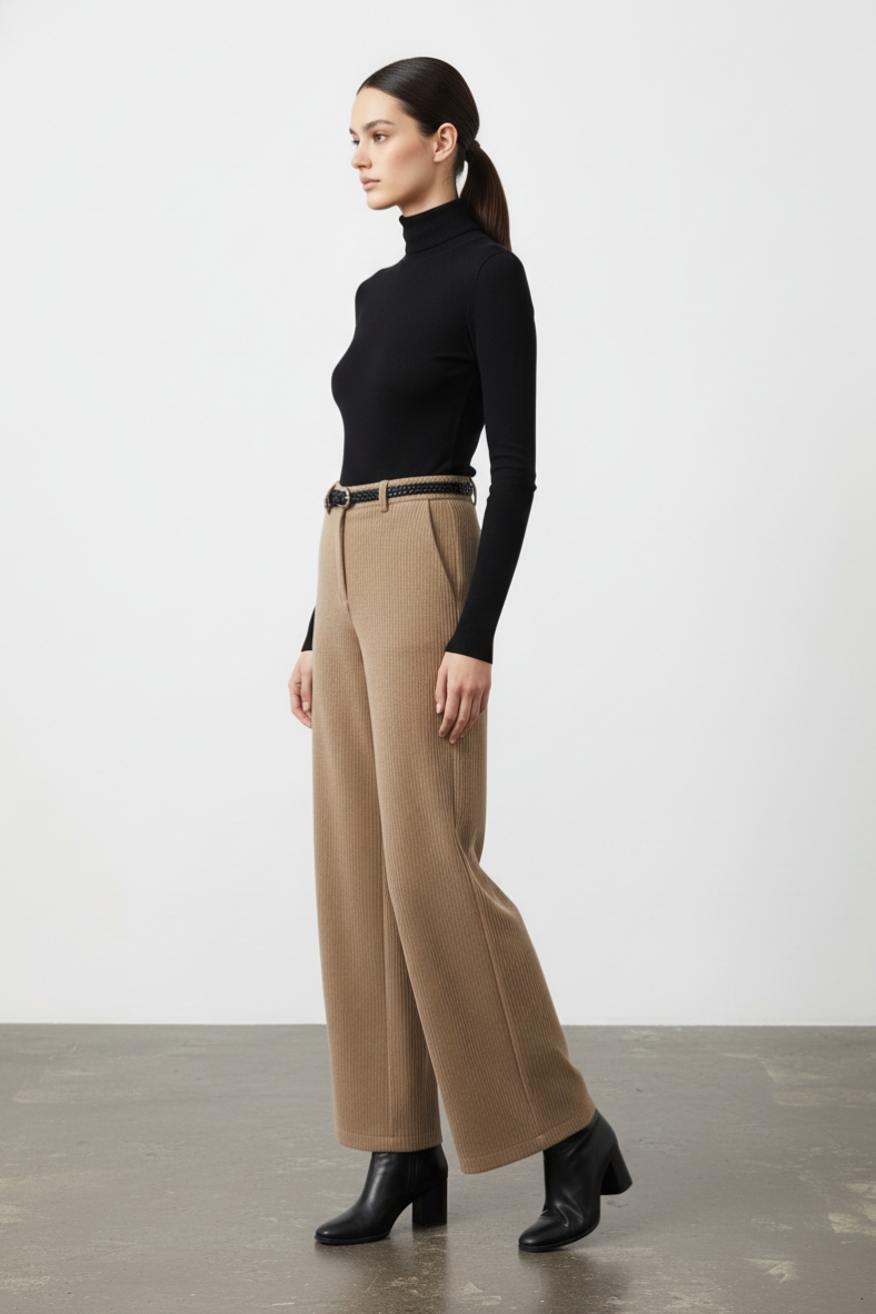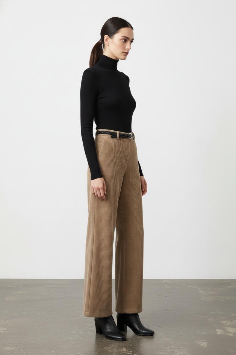 Il pantalone in velluto a costine è l’alleato perfetto per chi desidera un look sofisticato e contemporaneo. Realizzato con una composizione di alta qualità, questo pantalone offre una vestibilità comoda e un tocco di eleganza. La cintura in vita non solo valorizza la silhouette, ma aggiunge anche un dettaglio distintivo che rende questo capo unico. La sua tonalità neutra si abbina facilmente a una varietà di top, dai maglioni in cashmere ai bluse in seta, permettendo di creare outfit versatili per ogni occasione. Indossalo con una camicia aderente per un look da ufficio impeccabile o con un dolcevita per una serata casual ma chic. Le linee ampie e fluide del pantalone conferiscono movimento e comfort, rendendolo ideale per lunghe giornate. Completa il tuo outfit con stivali alti e una borsa a tracolla per un tocco finale di stile. Non perdere l’occasione di aggiungere questo pantalone ampio con cintura al tuo guardaroba: è un capo che non passerà mai di moda e che ti accompagnerà in ogni stagione.