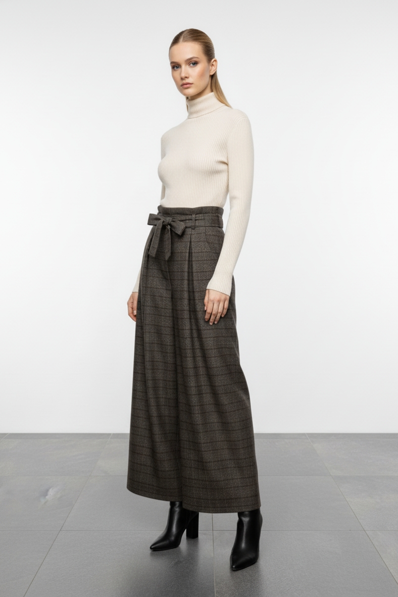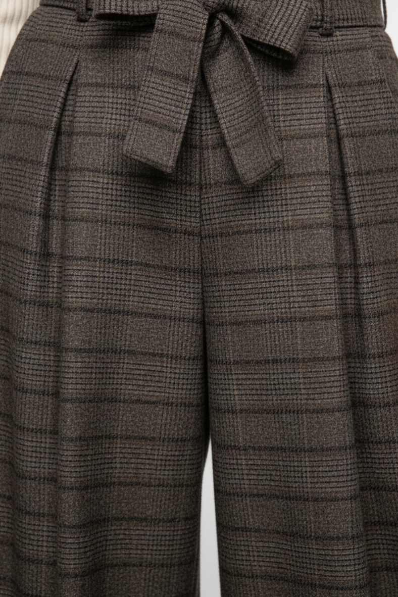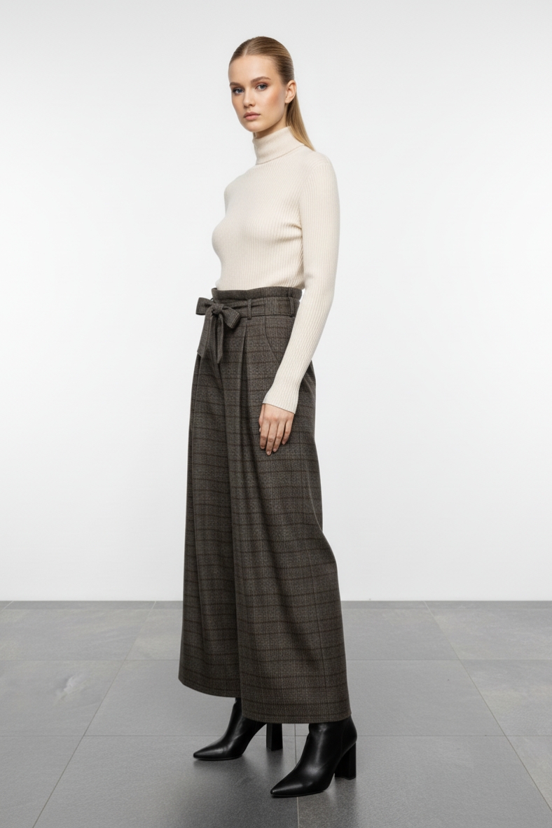 Il pantalone a palazzo fantasia tartan con cintura è un must-have per il tuo guardaroba autunnale. Realizzato in morbida viscosa, questo capo combina eleganza e comfort, perfetto per ogni occasione.