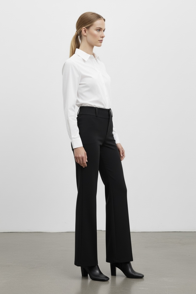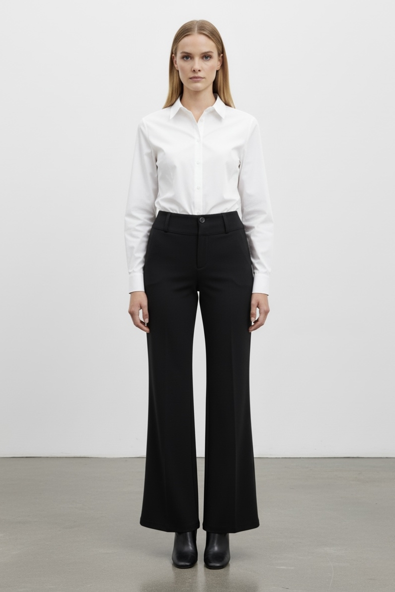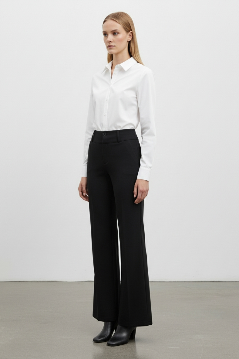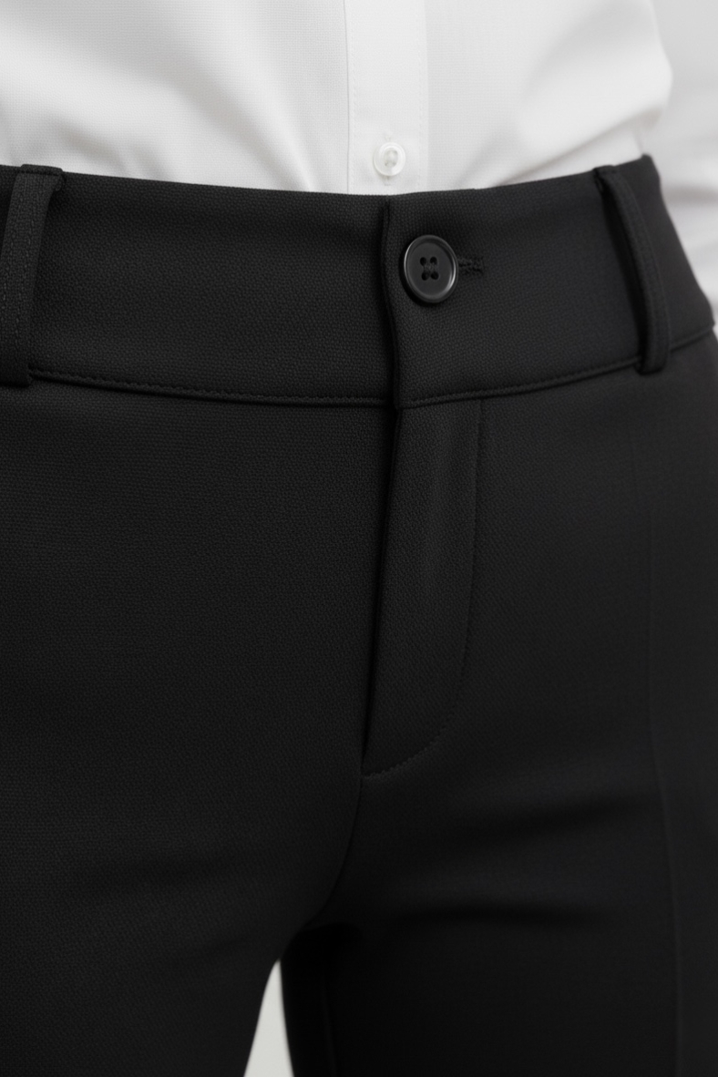 Il design minimalista è arricchito da dettagli raffinati, come la chiusura con bottone e le tasche laterali, che aggiungono un tocco di praticità senza compromettere l’eleganza. Questi pantaloni possono essere facilmente abbinati a una camicia bianca classica per un look professionale, oppure a un top in seta per una serata elegante.