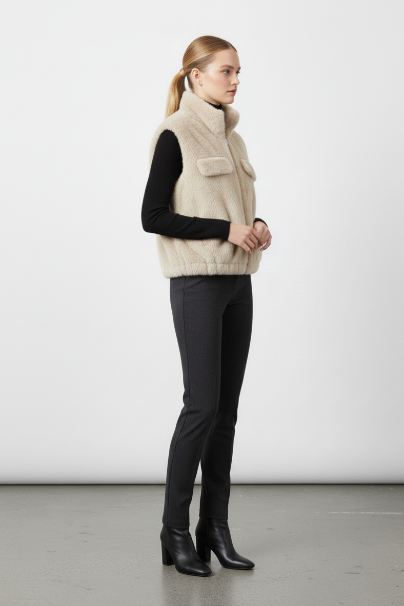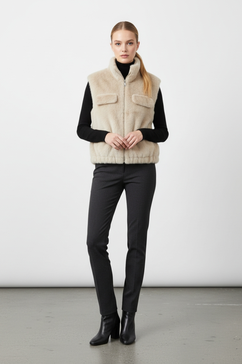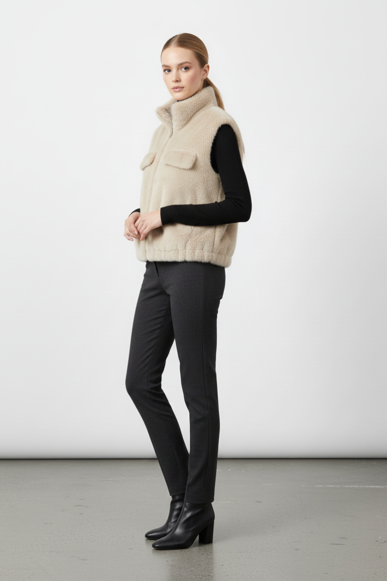 Per un outfit impeccabile, abbina questo gilet a un maglione a collo alto in cashmere e a un paio di pantaloni skinny in tessuto tecnico. Completa il look con stivali in pelle nera per un effetto chic e contemporaneo. Questo gilet è ideale anche per sovrapporlo su un abito lungo, creando un contrasto affascinante tra la morbidezza della pelliccia e la fluidità del tessuto dell’abito.