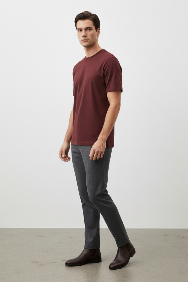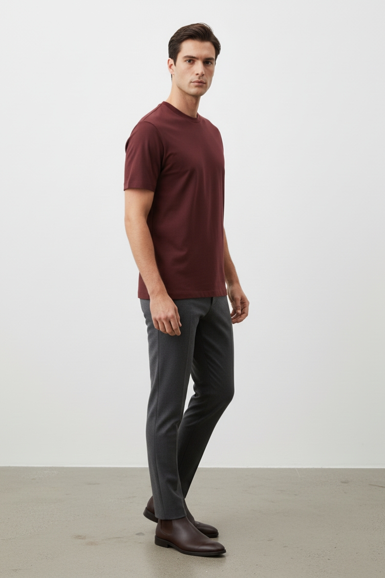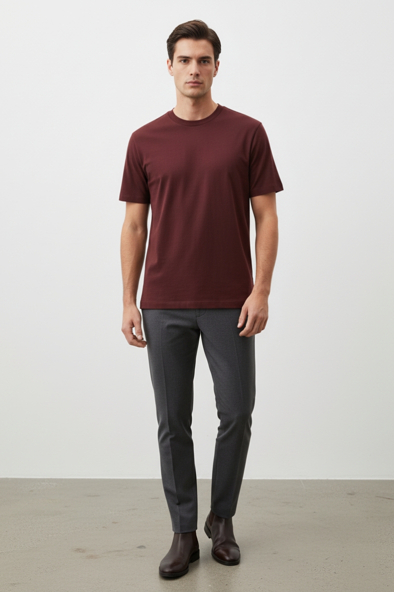 Perfetta da abbinare a pantaloni eleganti o jeans, questa T-shirt può essere facilmente stratificata sotto un blazer o una giacca per un look più formale. Scegli di indossarla con pantaloni slim fit per un outfit moderno e curato, oppure con un paio di joggers per un look casual e rilassato. La tonalità ricca e profonda della T-shirt aggiunge un tocco di eleganza al tuo guardaroba autunnale, rendendola un must-have per la stagione.