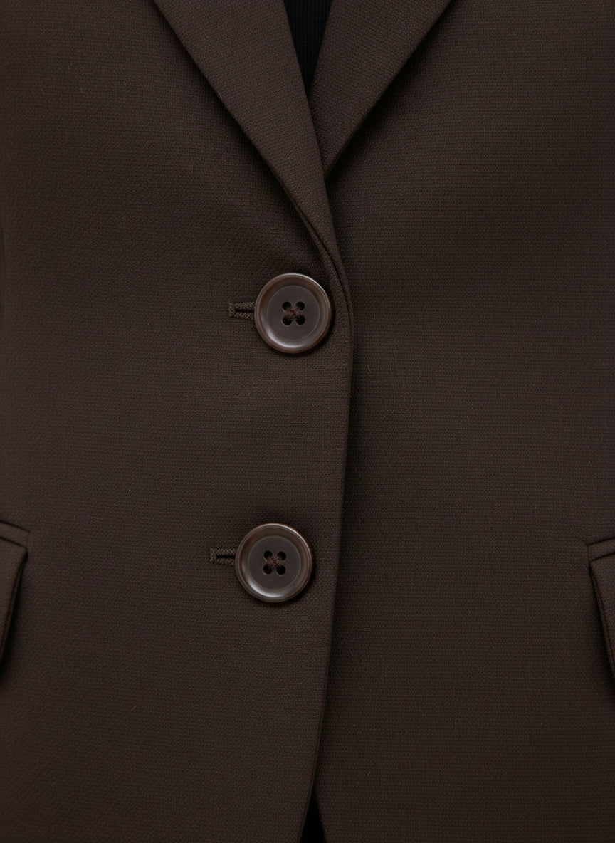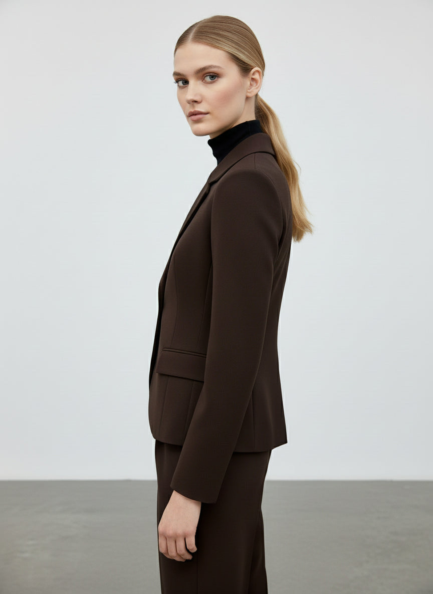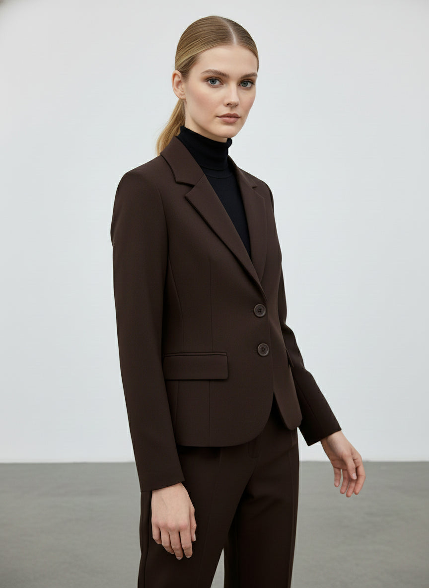 La giacca slim fit elegante è il capo perfetto per chi desidera un look raffinato e contemporaneo. Realizzata in viscosa, questo modello si distingue per la sua vestibilità aderente che valorizza la silhouette femminile. I dettagli come i bottoni frontali e le tasche a filetto conferiscono un tocco di classe, rendendola ideale per l'ufficio o per eventi formali. La tonalità marrone scuro è versatile e si abbina facilmente a una varietà di colori e stili.