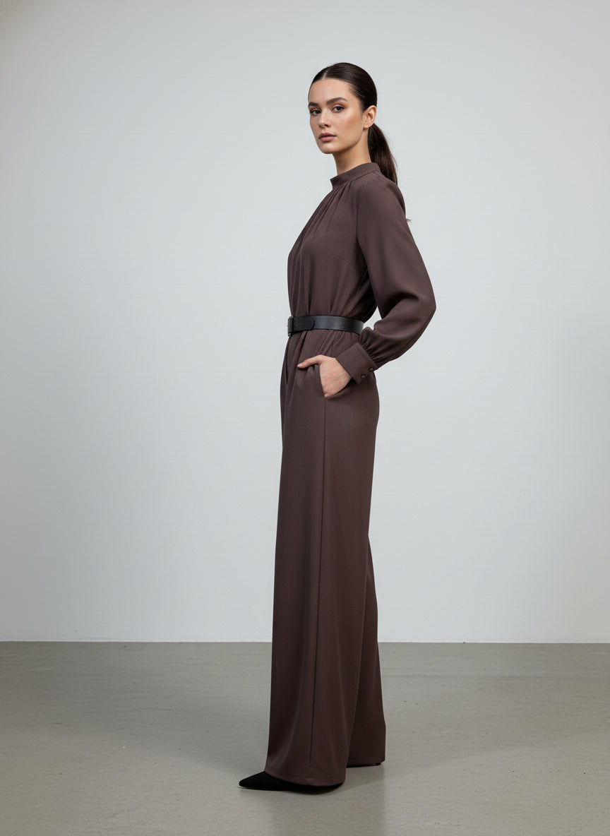 La tuta con pantalone ampio è un must-have per ogni donna che desidera unire comfort e stile. Caratterizzata da una vestibilità ampia e fluida, questa tuta presenta un colletto a giro e maniche lunghe, perfette per le fresche giornate autunnali. La cintura in vita non solo definisce la silhouette, ma aggiunge anche un tocco di eleganza al look complessivo. Realizzata in poliestere di alta qualità, il tessuto è morbido al tatto e scivola delicatamente sulla pelle, offrendo una sensazione di lusso ad ogni indossata.
